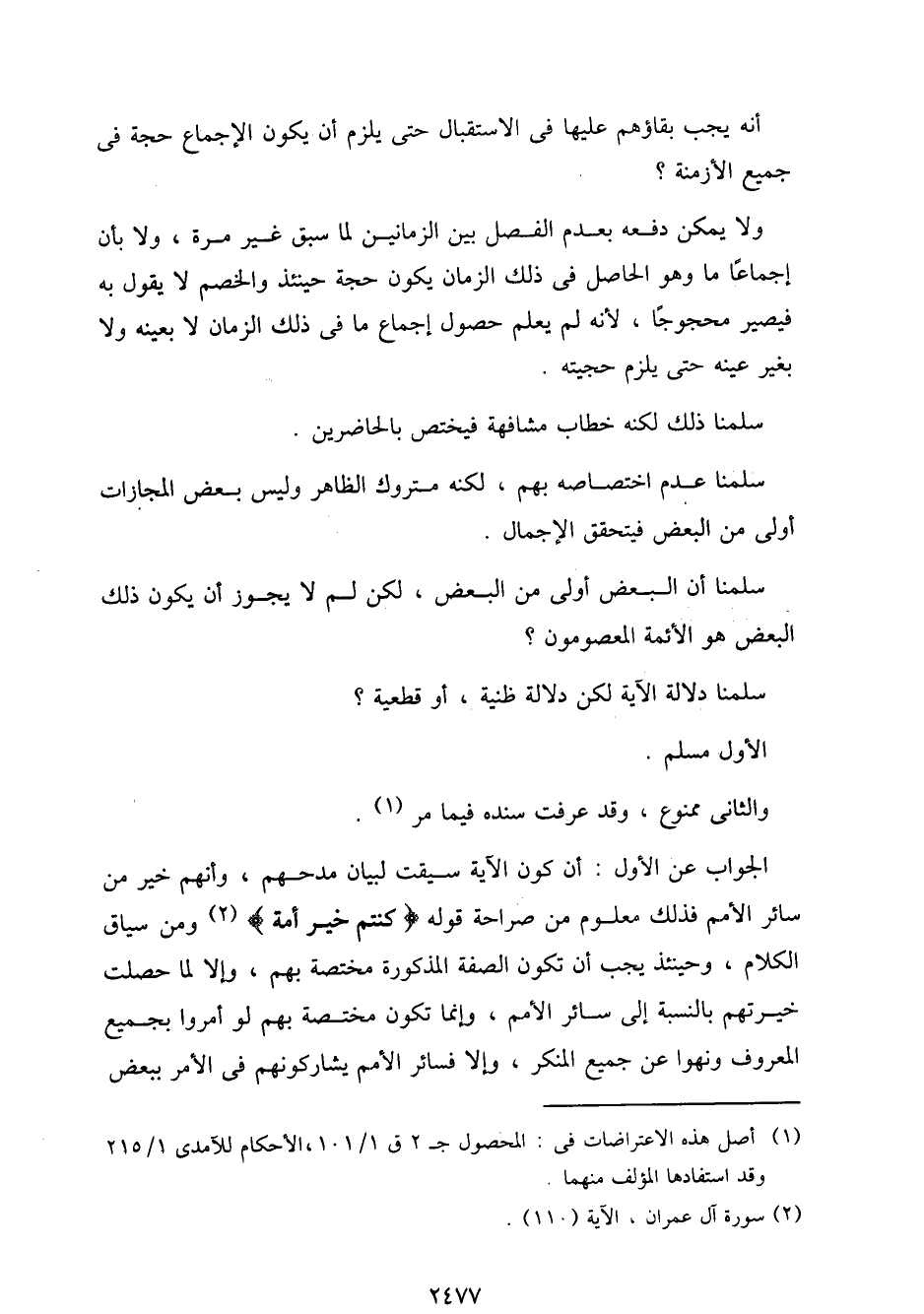 ولا يمكن دفعه بعدم الفصل بين الزمانين لما سبق غير مرة، ولا بأن إجماعًا ما وهو الحاصل في ذلك الزمان يكون حجة حينئذ والخصم لا يقول به فيصير محجوبًا، لأنه لم يعلم حصول إجماع ما في ذلك الزمان لا بعينه ولا بغير عينه حتى يلزم حجيته.