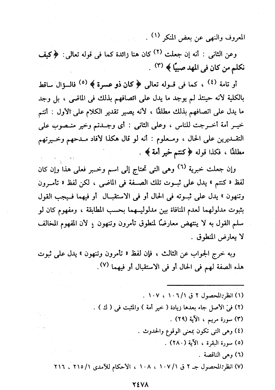 وإن جعلت خبرية وهي التي تحتاج إلى اسم وخبر فعلى هذا وإن كان لفظ "كنتم" يدل على ثبوت تلك الصفة في الماضي، لكن لفظ "تأمرون وتنهون" يدل على ثبوته في الحال أو في الاستقبال أو فيهما فيجب القول بثبوت مدلولهما لعدم المنافاة بين مدلوليهما بحسب المطابقة، ومفهوم كان لو سلم القول به لا ينتهض معارضًا لمنطوق تأمرون وتنهون؛ لأن المفهوم المخالف لا يعارض المنطوق.