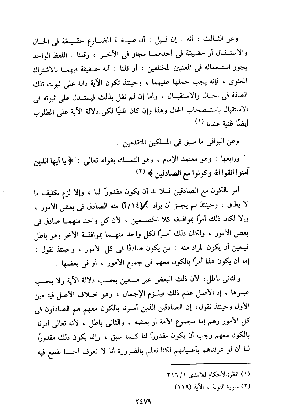 والثاني باطل، لأن ذلك البعض غير متعين بحسب دلالة الآية ولا بحسب غيرها، إذ الأصل عدم ذلك فيلزم الإجمال، وهو خلاف الأصل فيتعين الأول وحينئذ نقول، إن الصادقين الذين أمرنا بالكون معهم هم الصادقون في كل الأمور وهم إما مجموع الأمة أو بعضه، والثاني باطل، لأنه تعالى أمرنا بالطون معهم وجب أن يكون مقدورًا لنا كما سبق، وإنما يكون ذلك مقدورًا لنا أن لو عرفناهم بأعيانهم لكنا نعلم بالضرورة أنا لا نعرف أحدًا نقطع فيه