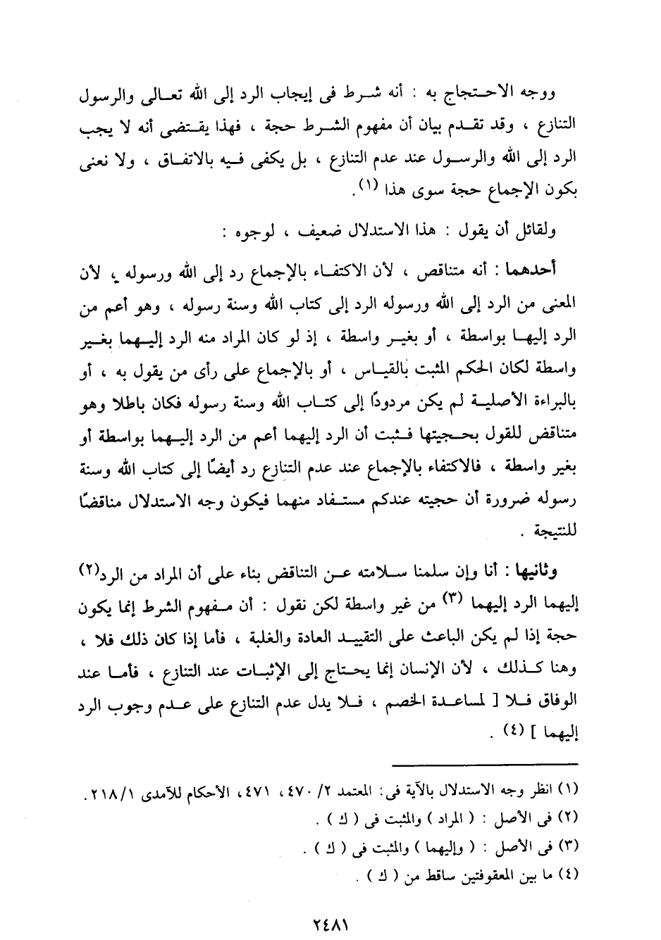 أحدهما: أنه متناقص، لأن الاكتفاء بالإجماع رد إلى الله ورسوله، لأن المعنى من الرد إلى الله ورسوله الرد إلى كتاب الله وسنة رسوله، وهو أعم من الرد إليها بواسطة، أو بغير واسطة، إذ لو كان المراد منه الرد إليهما بغير واسطة لكان الحكم المثبت بالقياس، أو بالإجماع على رأي من يقول به، أو بالبراءة الأصلية لم يكن مردودًا إلى كتاب الله وسنة رسوله فكان باطلاً وهو متناقض للقول بحجيتها فثبت أن الرد إليهما أعم من الرد إليهما بواسطة أو بغير واسطة، فالاكتفاء بالإجماع عند عدم التنازع رد أيضًا إلى كتاب الله وسنة رسوله ضرورة أن حجيته عندكم مستفاد منهما فيكون وجه الاستدلال مناقضًا للنتيجة.
