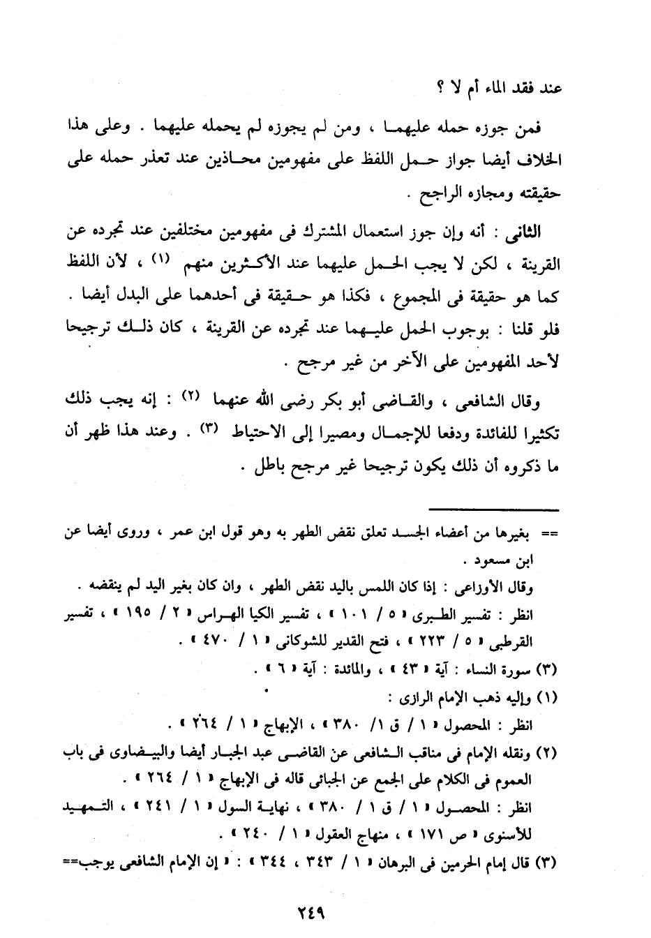 الثاني: أنه وإن جوز استعمال المشترك في مفهومين مختلفين عند تجرده عن القرينة، لكن لا يجب الحمل عليهما عند الأكثرين منهم، لأن اللفظ كما هو حقيقة في المجموع، فكذا هو حقيقة في أحدهما على البدل أيضا.