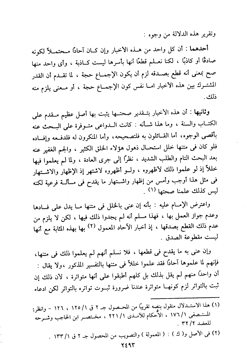 وثانيها: أن هذه الأخبار بتقدير صحتها يثبت بها أصل عظيم مقدم على الكتاب والسنة، وما هذا شأنه: كانت الدواعي متوفرة على البحث عنه بأقصى الوجوه، أما القائلون به فلتصحيحه، وأما المنكرون له فلدفعه وإفساده فلو كان في متنها خلل استحال ذهول هؤلاء الخلق الكثير، والجم الغفير عنه بعد البحث التام والطلب الشديد، نظرًا إلى جري العادة، ولما لم يعلموا فيها خللاً إذ لو علموا ذلك لأظهروه، ولو أظهروه لاشتهر إذ الإظهار والاشتهار في مثل هذا أوجب وأمس من إظهار واشتهار ما يقدح في مسألة فرعية لكنه ليس كذلك علمنا صحتها.