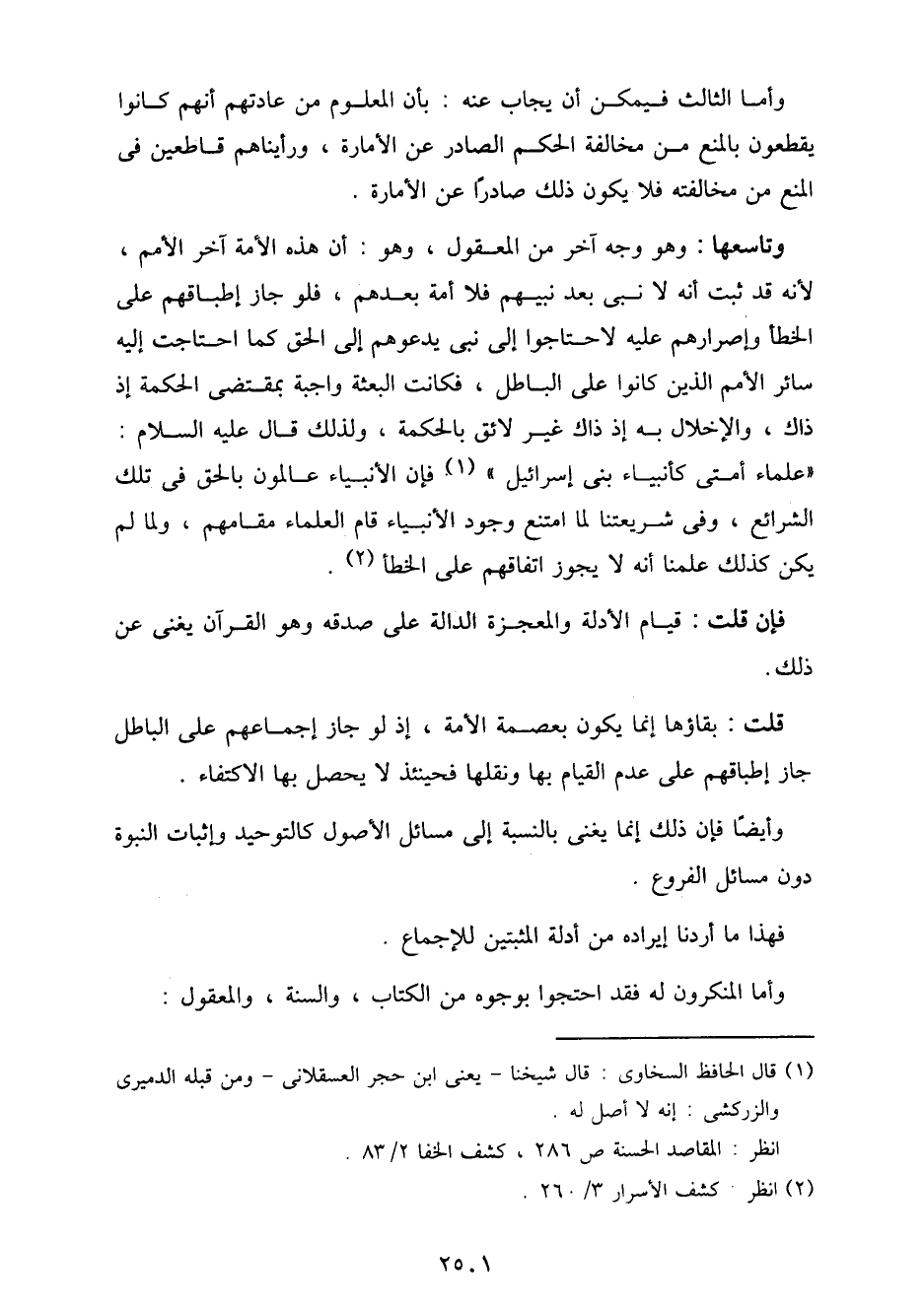 وتاسعها: وهو وجه آخر من المعقول، وهو: أن هذه الأمة آخر الأمم، لأنه قد ثبت أنه لا نبي بعد نبيهم فلا أمة بعدهم، فلو جاز إطباقهم على الخطأ وإصرارهم عليه لاحتاجوا إلى نبي يدعوهم إلى الحق كما احتاجت إليه سائر الأمم الذين كانوا على الباطل، فكانت البعثة واجبة بمقتضى الحكمة إذ ذاك، والإخلال به إذ ذاك غير لائق بالحكمة، ولذلك قال عليه السلام: "علماء أمتي كأنبياء بني إسرائيل" فإن الأنبياء عالمون بالحق في تلك الشرائع، وفي شريعتنا لما امتنع وجود الأنبياء قام العلماء مقامهم، ولما لم يكن كذلك علمنا أنه لا يجوز اتفاقهم على الخطأ.