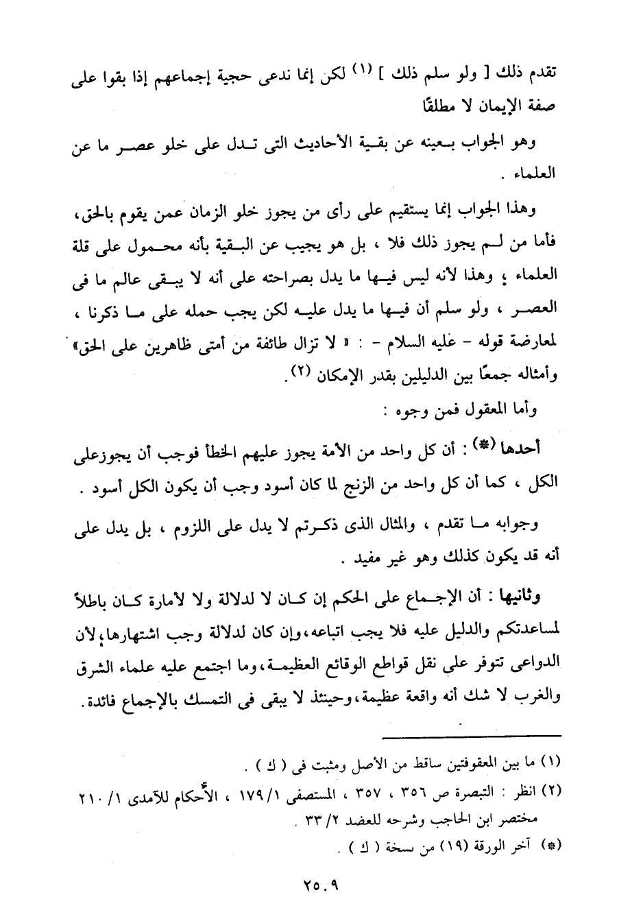 وهذا الجواب إنما يستقيم على رأي من يجوز خلو الزمان عمن يقوم بالحق، فأما من لم يجوز ذلك فلا، بل هو يجيب عن البقية بأنه محمول على قلة العلماء؛ وهذا لأنه ليس فيها ما يدل بصراحته على أنه لا يبقى عالم ما في العصر، ولو سلم أن فيها ما يدل عليه لكن يجب حمله على ما ذكرنا، لمعارضة قوله - عليه السلام -: "لا تزال طائفة من أمتي ظاهرين على الحق" وأمثاله جمعًا بين الدليلين بقدر الإمكان.
