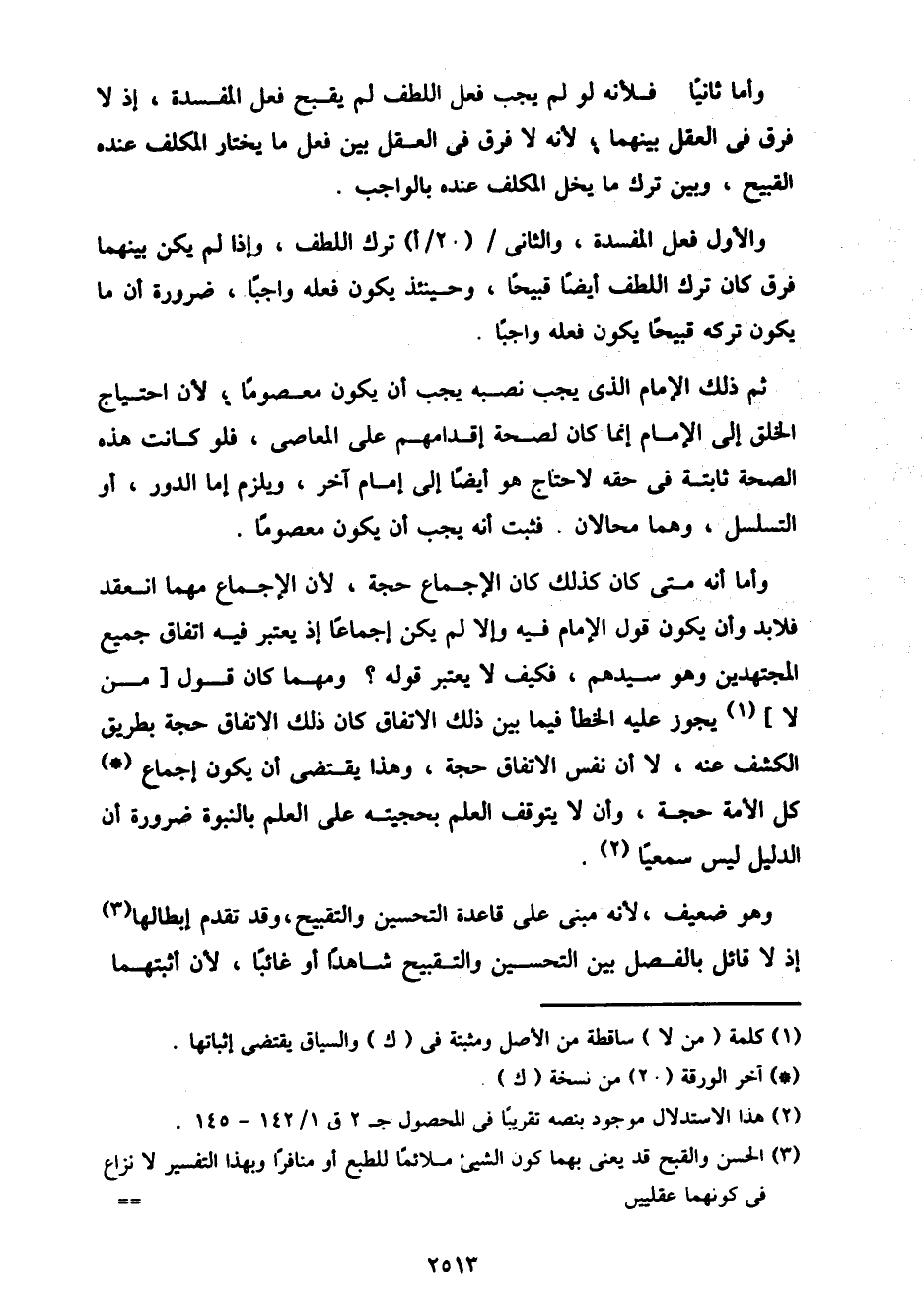 ثم ذلك الإمام الذي يجب نصبه يجب أن يكون معصومًا؛ لأن احتياج الخلق إلى الإمام إنما كان لصحة إقدامهم على المعاصي، فلو كانت هذه الصحة ثابتة في حقه لاحتاج هو أيضًا إلى إمام آخر، ويلزم إما الدور، أو التسلسل، وهما محالان. فثبت أنه يجب أن يكون معصومًا.
