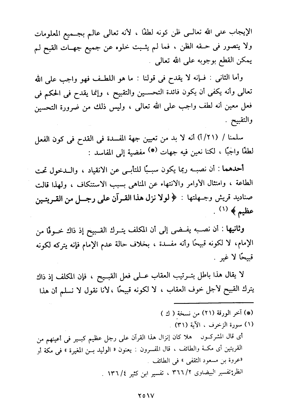 وأما الثاني: فإنه لا يقدح في قولنا: ما هو اللطف فهو واجب على الله تعالى وأنه يكفي أن يكون فائدة التحسين والتقبيح، وإنما يقدح في الحكم في فعل معين أنه لطف واجب على الله تعالى، وليس ذلك من ضرورة التحسين والتقبيح.