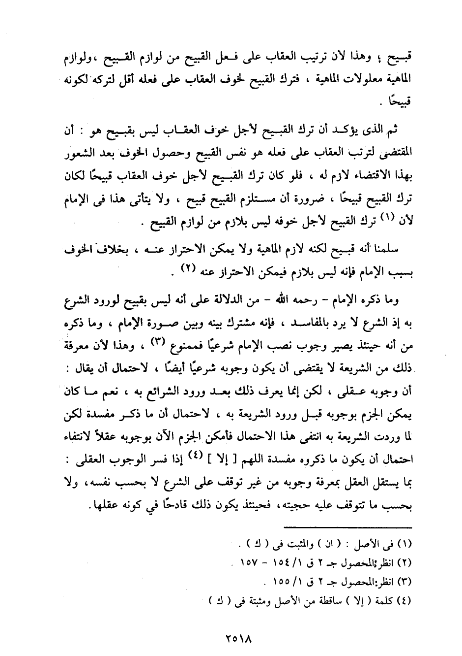 وما ذكره الإمام - رحمه الله - من الدلالة على أنه ليس بقبيح لورود الشرع به إذ الشرع لا يرد بالمفاسد، فإنه مشترك بينه وبين صورة الإمام، وما ذكره من أنه حينئذ يصير وجوب نصب الإمام شرعيًا فممنوع، وهذا لأن معرفة ذلك من الشريعة لا يقتضي أن يكون وجوبه شرعيًا أيضًا، لاحتمال أن يقال: أن وجوبه عقلي، لكن إنما يعرف ذلك بعد ورود الشرائع به، نعم ما كان يمكن الجزم بوجوبه قبل ورود الشريعة به، لاحتمال أن ما ذكر مفسدة لكن لما وردت الشريعة به انتفى هذا الاحتمال فأمكن الجزم الآن بوجوبه عقلاً لانتفاء احتمال أن يكون ما ذكروه مفسدة اللهم [إلا] إذا فسر الوجوب العقلي: بما يستقل العقل بمعرفة وجوبه من غير توقف على الشرع لا بحسب نفسه، ولا بحسب ما تتوقف عليه حجيته، فحينئذ يكون ذلك قادحًا في كونه عقلها.