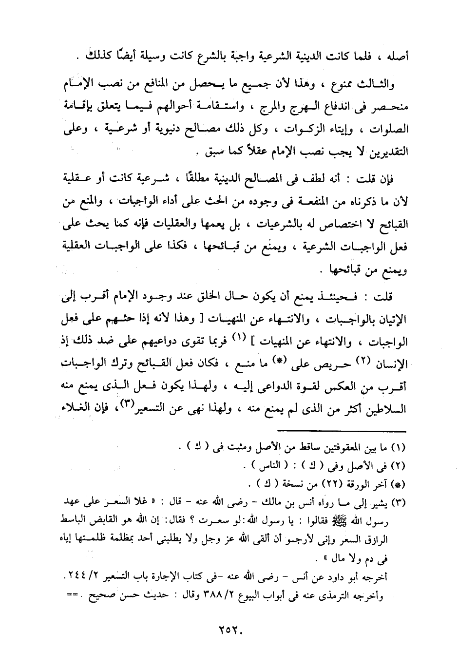 قلت: فحينئذ يمنع أن يكون حال الخلق عند وجود الإمام أقرب إلى الإتيان بالواجبات، والانتهاء عن المنهيات [وهذا لأنه إذا حثهم على فعل الواجبات، والانتهاء عن المنهيات] فربما تقوى دواعيهم على ضد ذلك إذ الإنسان حريص على ما منع، فكان فعل القبائح وترك الواجبات أقرب من العكس لقوة الدواعي إليه، ولهذا يكون فعل الذي يمنع منه السلاطين أكثر من الذي لم يمنع منه، ولهذا نهى عن التسعير، فإن الغلاء