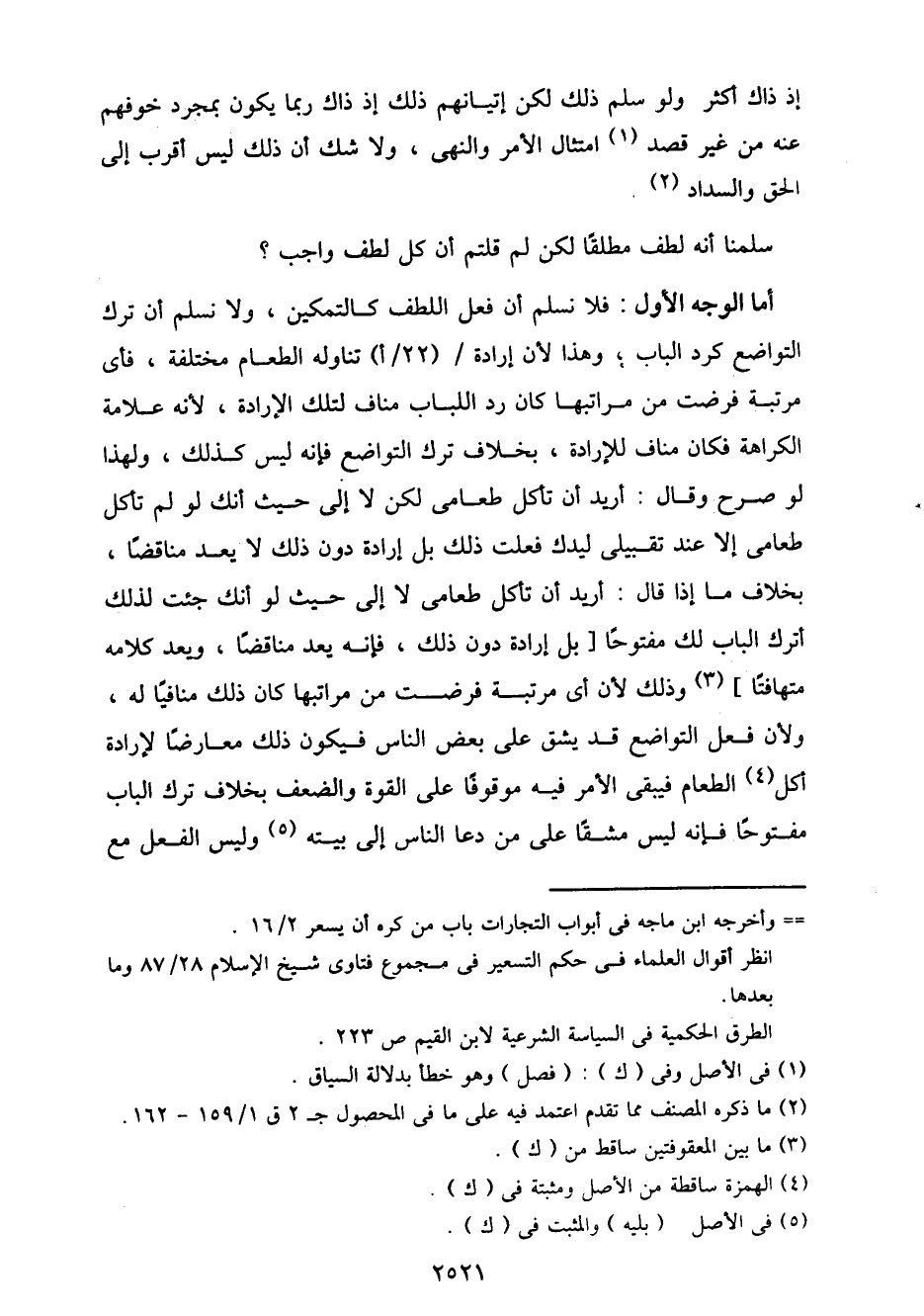 أما الوجه الأول: فلا نسلم أن فعل اللطف كالتمكين، ولا نسلم أن ترك التوتضع كرد الباب؛ وهذا لأن إرادة/ (22/ أ) تناوله الطعام مختلفة، فأي مرتبة فرضت من مراتبها كان رد اللباب مناف لتلك الإرادة، لأنه علامة الكراهة فكان مناف للإرادة، بخلاف ترك التواضع فإنه ليس كذلك، ولهذا لو صرح وقال: أريد أن تأكل طعامي لكن لا إلى حيث أنك لو لم تأكل طعامي إلا عند تقبيلي ليدك فعلت ذلك بل إرادة دون ذلك لا يعد مناقضًا، بخلاف ما إذا قال: أريد أن تأكل طعامي لا إلى حيث لو أنك جئت لذلك أترك الباب لك مفتوحًا [بل إرادة دون ذلك، فإنه يعد مناقضًا، ويعد كلامه متهافتًا] وذلك لأن أي مرتبة فرضت من مراتبها كان ذلك منافيًا له، ولأن فعل التواضع قد يشق على بعض الناس فيكون ذلك معارضًا لإرادة أكل الطعام فيبقى الأمر فيه موقوفًا على القوة والضعف بخلاف ترك الباب مفتوحًا فإنه ليس مشقًا على من دعا الناس إلى بيته وليس الفعل مع