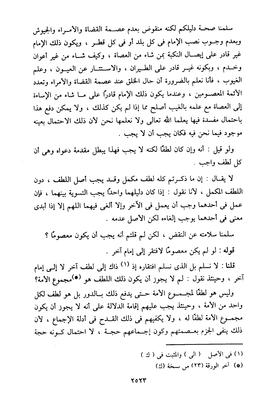 سلمنا صحة دليلكم لكنه منقوض بعدم عصمة القضاة والأمراء والجيوش وبعدم وجوب نصب الإمام في كل بلد أو في كل قطر، ويكون ذلك الإمام غير قادر على إيصال النكبة بمن شاء من العصاة، وكيف شاء من غير أعوان وخدم، وبكونه غير قادر على الطيران، والاستتار عن العيون، وعلم الغيوب، فأنا نعلم بالضرورة أن حال الخلق عند عصمة القضاة والأمراء وتعدد الأئمة المعصومين، وعندما يكون ذلك الإمام قادرًا على ما شاء من الإساءة إلى العصاة مع علمه بالغيب أصلح مما إذا لم يكن كذلك، ولا يمكن دفع هذا باحتمال مفسدة فيها يعلما الله تعالى ولا نعلمها نحن لأن ذلك الاحتمال بعينه موجود فيما نحن فيه فكان يجب أن لا يجب.