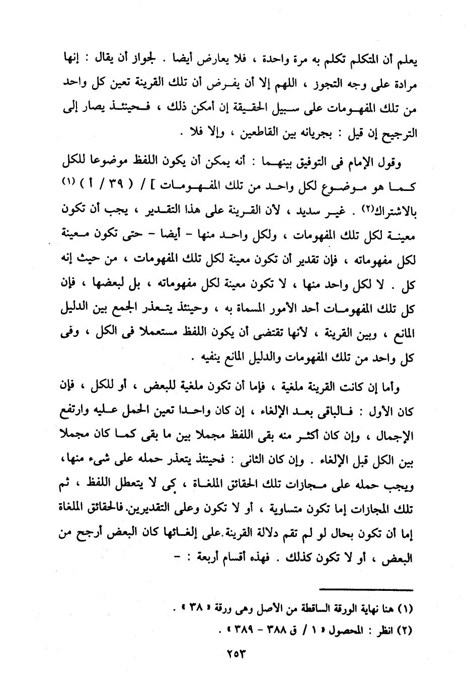 وقول الإمام في التوفيق بينهما: أنه يمكن أن يكون اللفظ موضوعا للكل كما هو موضوع لكل واحد من تلك المفهومات] / (39/أ) بالاشتراك. غير سديد، لأن القرينة على هذا التقدير، يجب أن تكون معينة لكل تلك المفهومات، ولكل واحد منها- أيضا- حتى تكون معينة لكل مفهوماته، فإن تقدير أن تكون معينة لكل تلك المفهومات، من حيث إنه قل: لا لكل واحد منها، لا تكون معينة لكل مفهوماته، بل لبعضها، فإن كل تلك المفهومات أحد الأمور المسماة به، وحينئذ يتعذر الجمع بين الدليل المانع، وبين القرينة، لأنها تقتضي أن يكون اللفظ مستعملا في الكل، وفي كل واحد من تلك المفهومات والدليل المانع ينفيه.