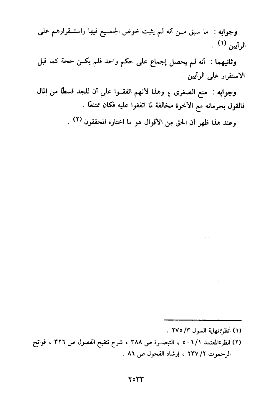 وجوابه: منع الصغرى؛ وهذا لأنهم اتفقوا على أن للجد قسطًا من المال فالقول بحرمانه مع الأخوة مخالفة لما اتفقوا عليه فكان ممتنعًا.
