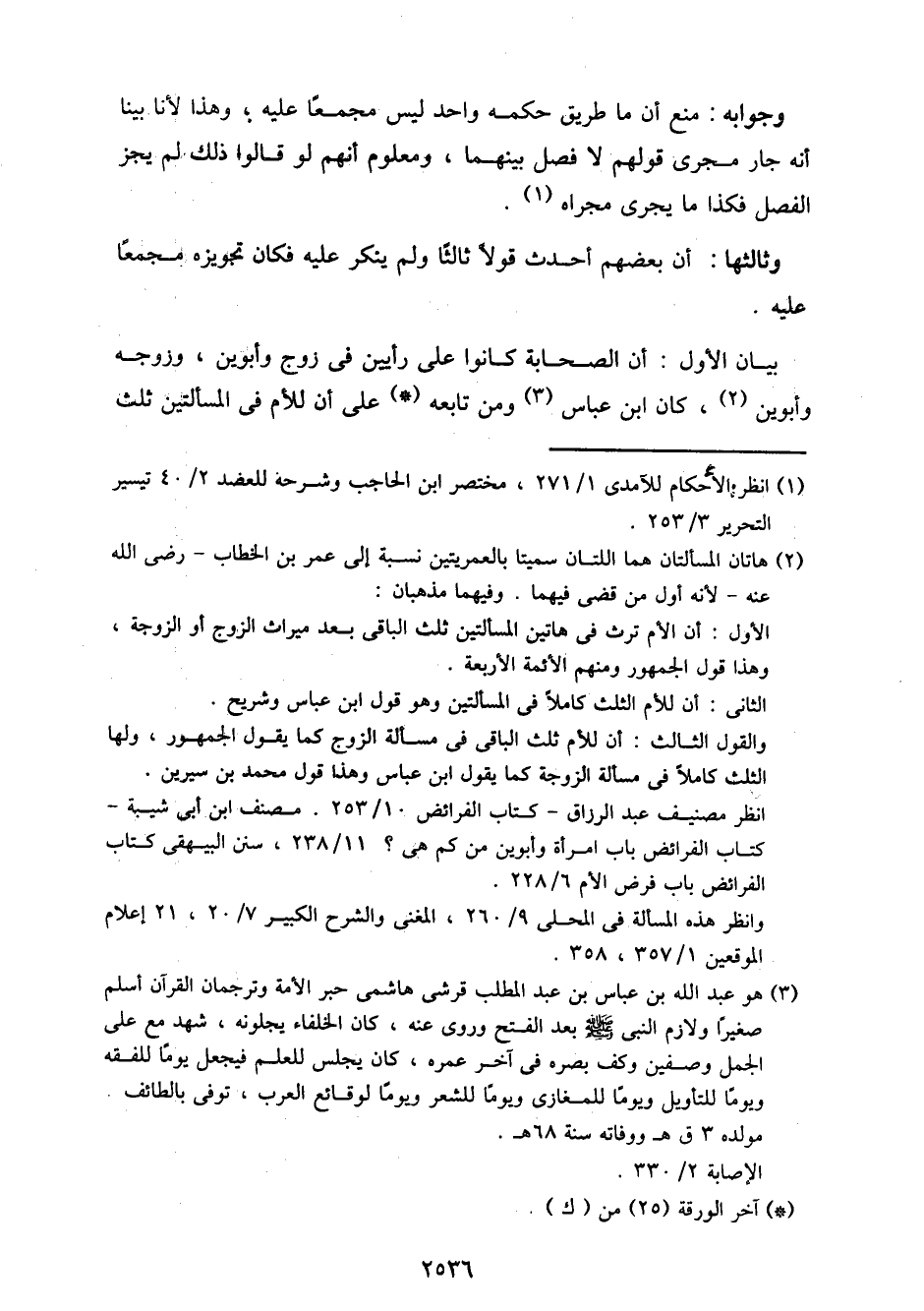 بيان الأول: أن الصحابة كانوا على رأيين في زوج وأبوين، وزوجه وأبوين، كان ابن عباس ومن تابعه على أن للأم في المسألتين ثلث