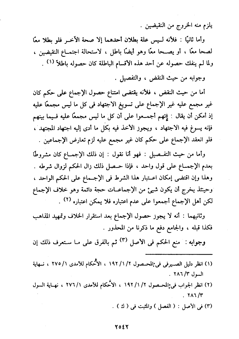 وأما من حيث التفصيل: فهو أنا نقول: إن ذلك الإجماع كان مشروطًا بعدم الإجماع على قول واحد، فإذا حصل ذلك زال الحكم لزوال شرطه. وهذا وإن اقتضى إمكان اعتبار هذا الشرط في الإجماع على الحكم الواحد، وحينئذ يخرج أن يكون شيء من الإجماعات حجة دائمة وهو خلاف الإجماع لكن أهل الإجماع أجمعوا على عدم اعتباره فلا يمكن اعتباره.
