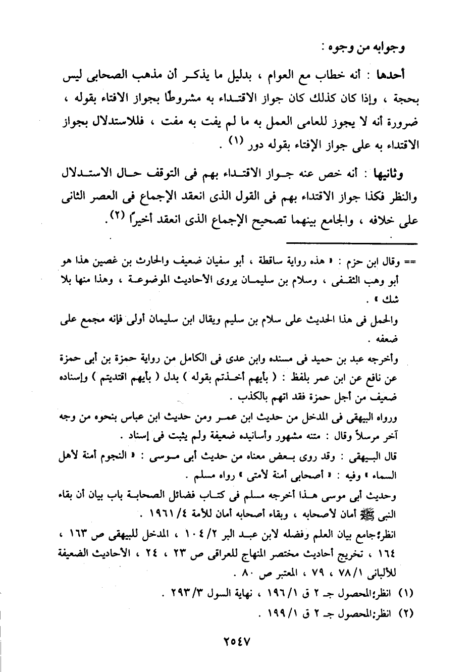 وثانيها: أنه خص عنه جواز الاقتداء بهم في التوقف حال الاستدلال والنظر فكذا جواز الاقتداء بهم في القول الذي انعقد الإجماع في العصر الثاني على خلافه، والجامع بينهما تصحيح الإجماع الذي انعقد أخيرًا.