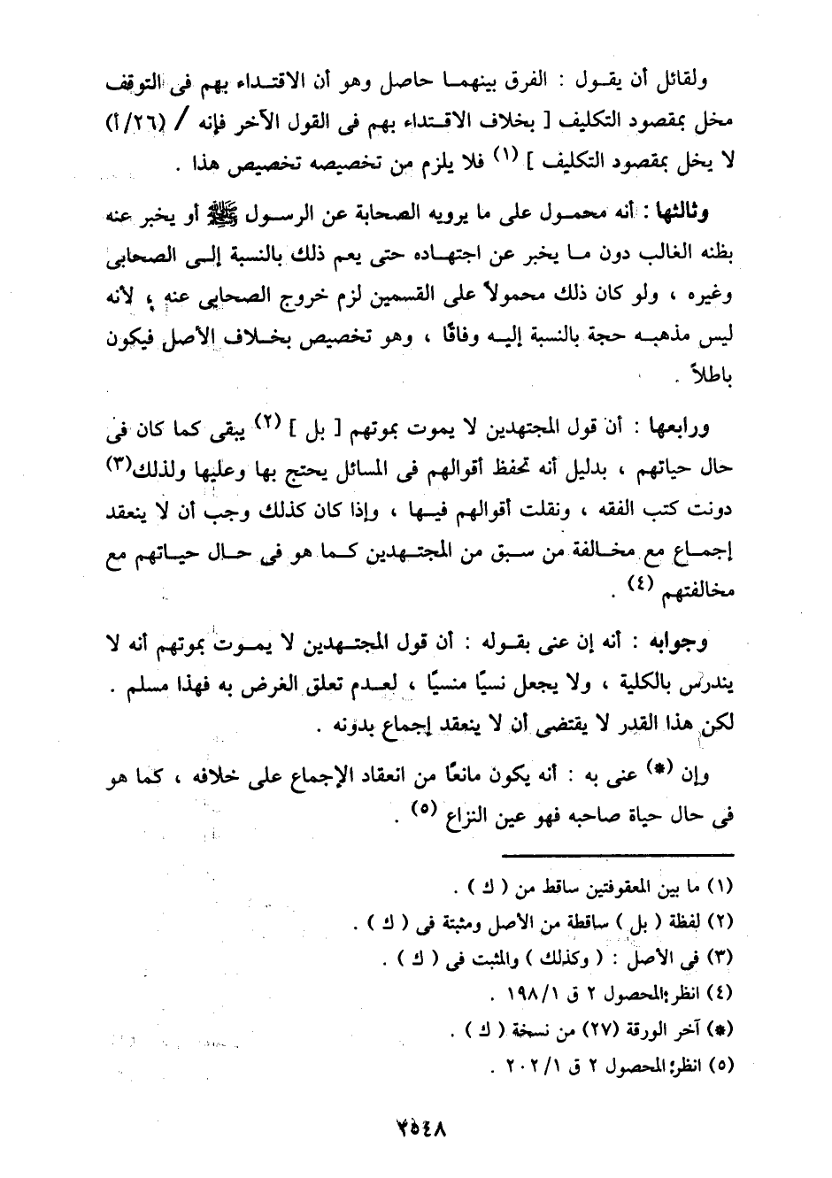 ولقائل أن يقول: الفرق بينهما حاصل وهو أن الاقتداء بهم في التوقف مخل بمقصود التكليف [بخلاف الاقتداء في القول الآخر فإنه/ (26/ أ) لا يخل بمقصود التكليف] فلا يلزم من تخصيصه تخصيص هذا.