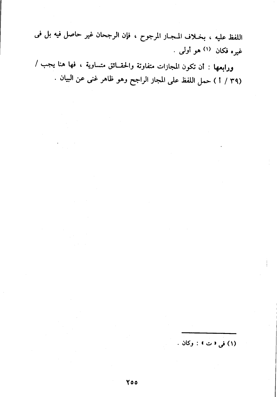 ورابعها: أن تكون المجازات متفاوتة والحقائق متساوية، فهاهنا يجب/ (39/أ) حمل اللفظ على المجاز الراجح وهو ظاهر غني عن البيان.