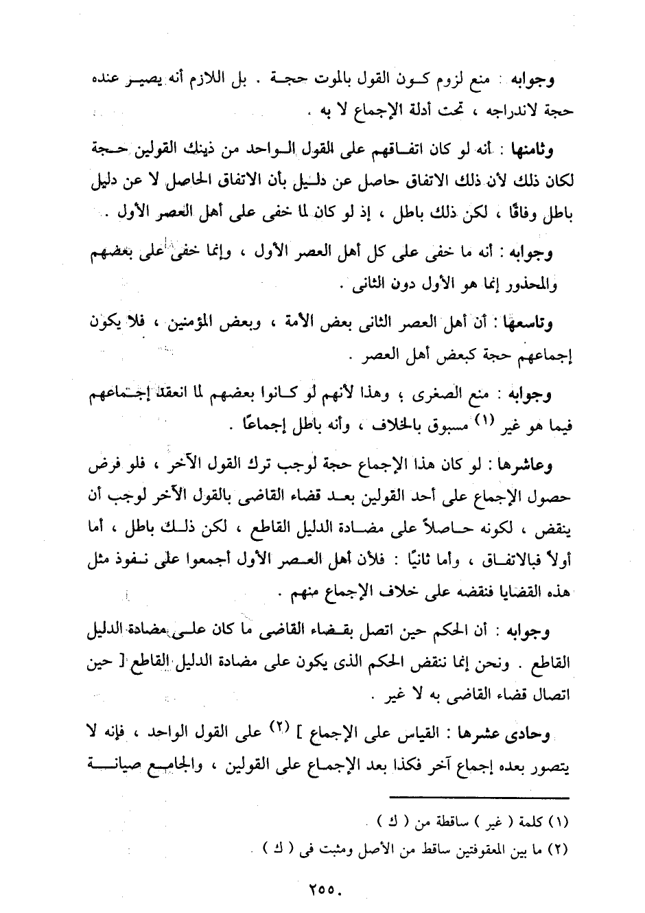 وعاشرها: لو كان هذا الإجماع حجة لوجب ترك القول الآخر، فلو فرض حصول الإجماع على أحد القولين بعد قضاء القاضي بالقول الآخر لوجب أن ينقض، لكونه حاصلاً على مضادة الدليل القاطع، لكن ذلك باطل، أما أولاً فبالاتفاق، وأما ثانيًا: فلأن أهل العصر الأول أجمعوا على نفوذ مثل هذه القضايا فنقضه على خلاف الإجماع منهم.