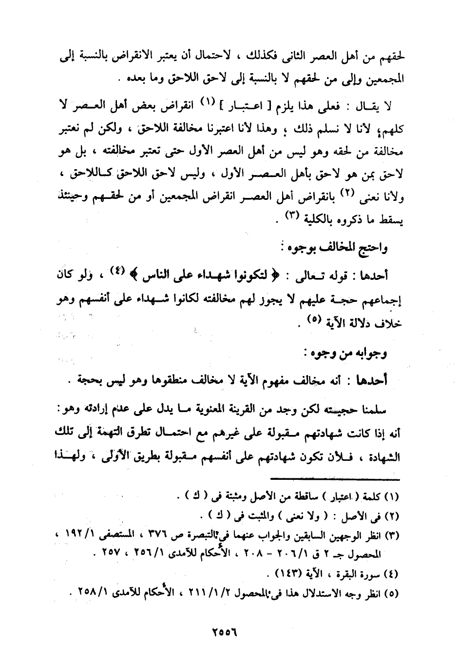 لا يقال: فعلى هذا يلزم [اعتبار] انقراض بعض أهل العصر لا كلهم؛ لأنا لا نسلم ذلك؛ وهذا لأنا اعتبرنا مخالفة اللاحق، ولكن لم نعتبر مخالفة من لحقه وهو ليس من أهل العصر الأول حتى تعتبر مخالفته، بل هو لاحق بمن هو لاحق بأهل العصر الأول، وليس لاحق اللاحق كاللاحق، ولأنا نعني بانقراض أهل العصر انقراض المجمعين أو من لحقهم وحينئذ يسقط ما ذكروه بالكلية.