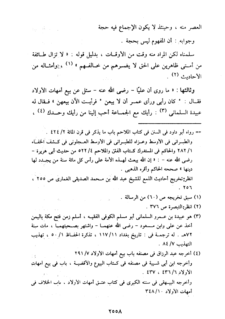 وثالثها: "ما روي أن عليًا - رضي الله عنه - سئل عن بيع أمهات الأولاد فقال: "كان رأيي ورأي عمر أن لا يبعن* فرأيت الآن بيعهن" فقال له عبيدة السلماني: رأيك مع الجماعة أحب إلينا من رأيك وحدك،