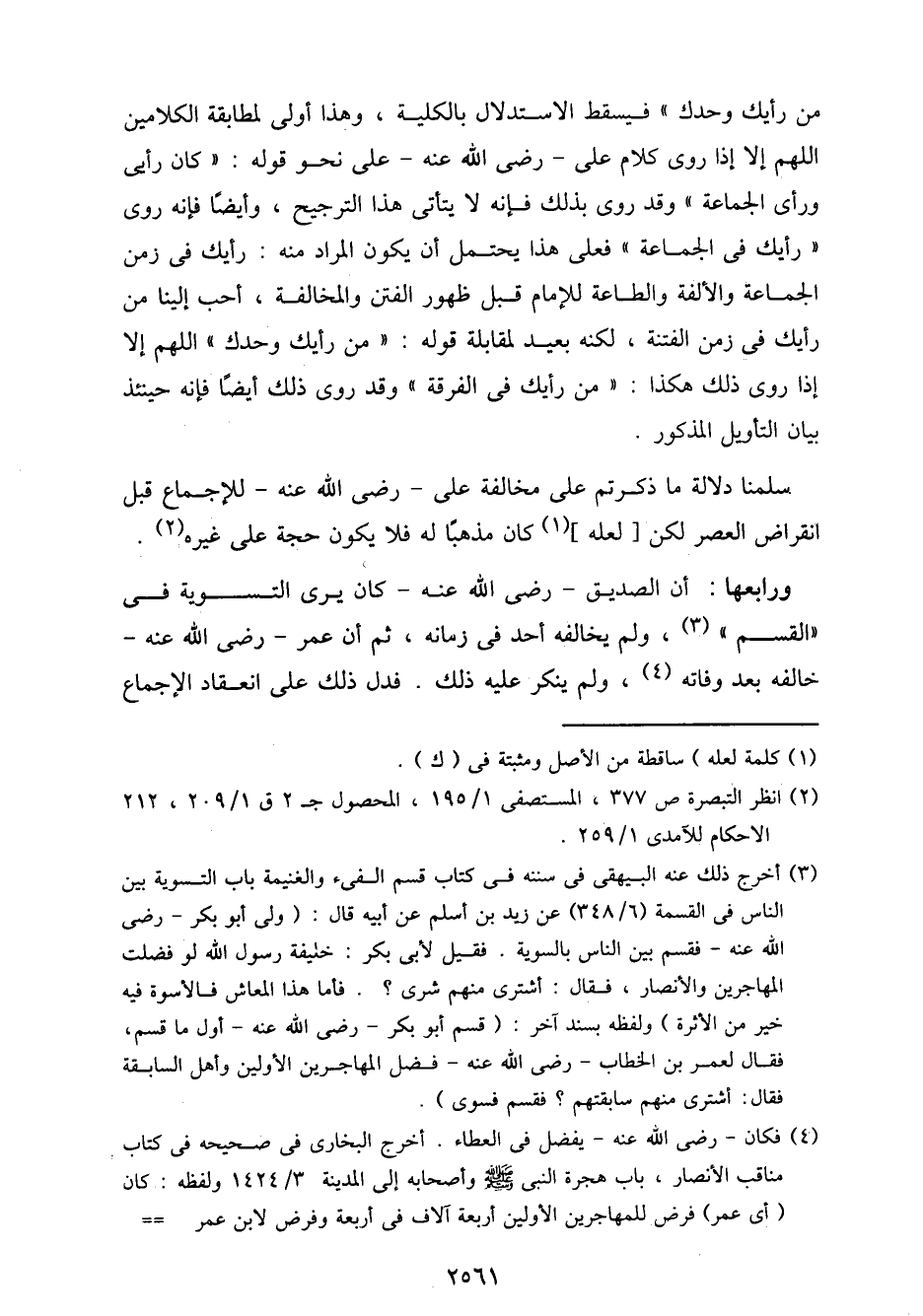 ورابعها: أن الصديق - رضي الله عنه - كان يرى التسوية في "القسم"، ولم يخالفه أحد في زمانه، ثم أن عمر - رضي الله عنه - خالفه بعد وفاته، ولم ينكر عليه ذلك. فدل ذلك على انعقاد الإجماع
