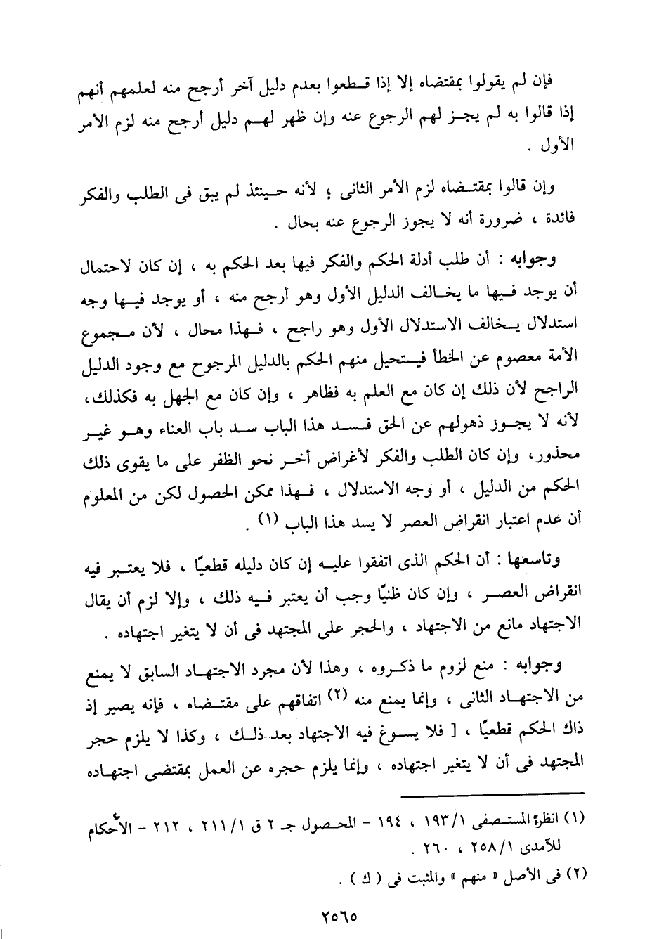 وجوابه: أن طلب أدلة الحكم والفكر فيها بعد الحكم به، إن كان لاحتمال أن يوجد فيها ما يخالف الدليل الأول وهو أرجح منه، أو يوجد فيها وجه استدلال يخالف الاستدلال الأول وهو راجح، فهذا محال، لأن مجموع الأمة معصوم عن الخطأ فيستحيل منهم الحكم بالدليل المرجوح مع وجود الدليل الراجح لأن ذلك إن كان مع العلم به فظاهر، وإن كان مع الجهل به فكذلك، لأنه لا يجوز ذهولهم عن الحق فسد هذا الباب سد باب العناء وهو غير محذور، وإن كان الطلب والفكر لأغراض أخر نحو الظفر على ما يقوى ذلك الحكم من الدليل، أو وجه الاستدلال، فهذا ممكن الحصول لكن من المعلوم أن عدم اعتبار انقراض العصر لا يسد هذا الباب.