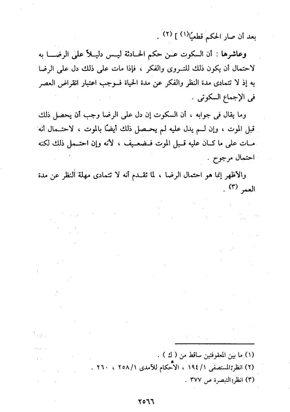 وعاشرها: أن السكوت عن حكم الحادثة ليس دليلاً على الرضا به لاحتمال أن يكون ذلك للتروي والفكر، فإذا مات على ذلك دل على الرضا به إذ لا تتمادى مدة النظر والفكر عن مدة الحياة فوجب اعتبار انقراض العصر في الإجماع السكوتي.