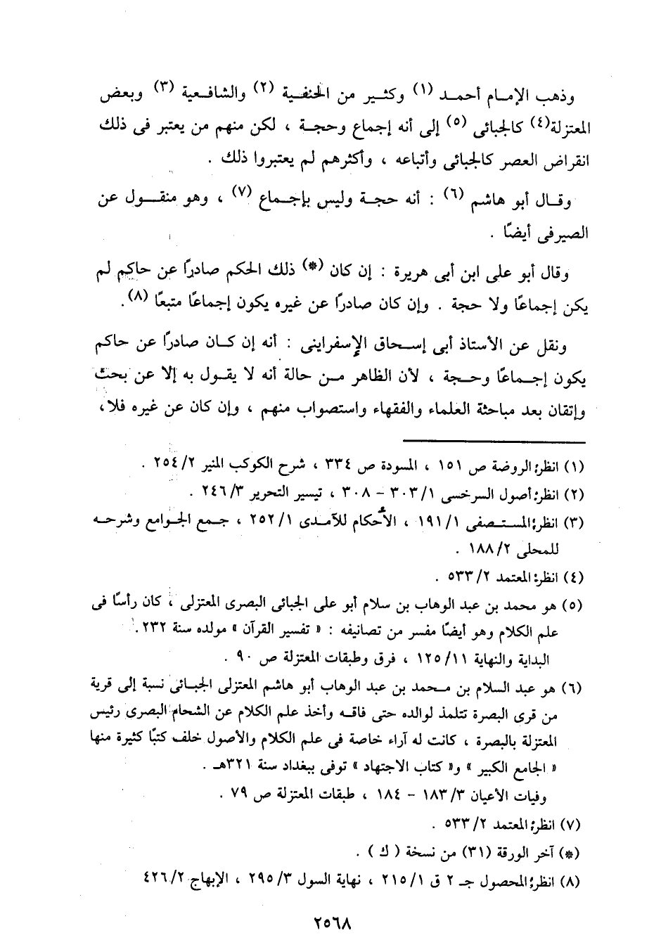 وذهب الإمام أحمد وكثير من الحنفية والشافعية وبعض المعتزلة كالجبائي إلى أنه إجماع وحجة، لكن منهم من يعتبر في ذلك انقراض العصر كالجبائي وأتباعه، وأكثرهم لم يعتبروا ذلك.