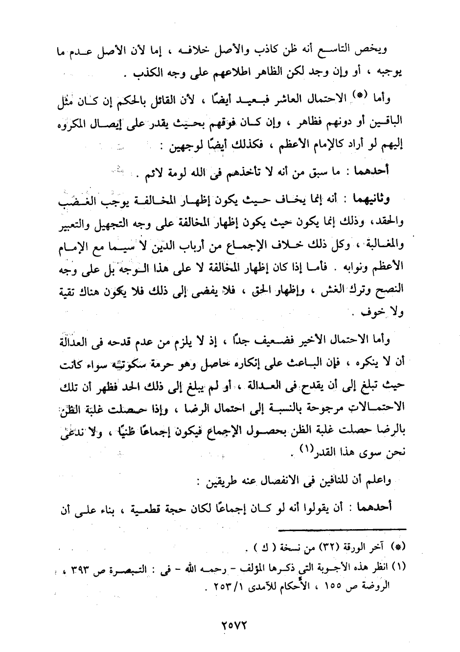 وأما الاحتمال الأخير فضعيف جدًا، إذ لا يلزم من عدم قدحه في العدالة أن لا ينكره، فإن الباعث على إنكاره حاصل وهو حرمة سكوته سواء كانت حيث تبلغ إلى أن يقدح في العدالة، أو لم يبلغ إلى ذلك الحد فظهر أن تلك الاحتمالات مرجوحة بالنسبة إلى احتمال الرضا، وإذا حصلت غلبة الظن بالرضا حصلت غلبة الظن بحصول الإجماع فيكون إجماعًا ظنيًا، ولا ندعي نحن سوى هذا القدر.