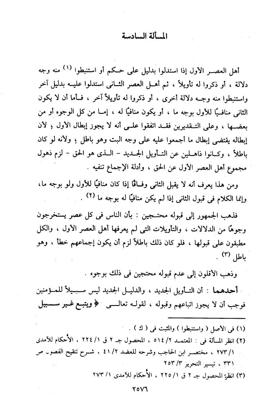 أهل العصر الأول إذا استدلوا بدليل على حكم أو استنبطوا منه وجه دلالة، أو ذكروا له تأويلاً، ثم أهل العصر الثاني استدلوا عليه بدليل آخر واستنبطوا منه وجه دلالة أخرى، أو ذكروا له تأويلاً آخر، فأما أن لا يكون الثاني منافيًا للأول بوجه ما، أو يكون منافيًا له، إما من كل الوجوه أو من بعضها، وعلى التقديرين فقد اتفقوا على أنه لا يجوز إبطال الأول؛ لأن إبطاله يقتضي إبطال ما أجمعوا عليه على وجه البت وهو باطل؛ ولأنه لو كان باطلاً، وكانوا ذاهلين عن التأويل الجديد - الذي هو الحق - لزم ذهول مجموع أهل العصر الأول عن الحق، وأدلة الإجماع تنفيه.