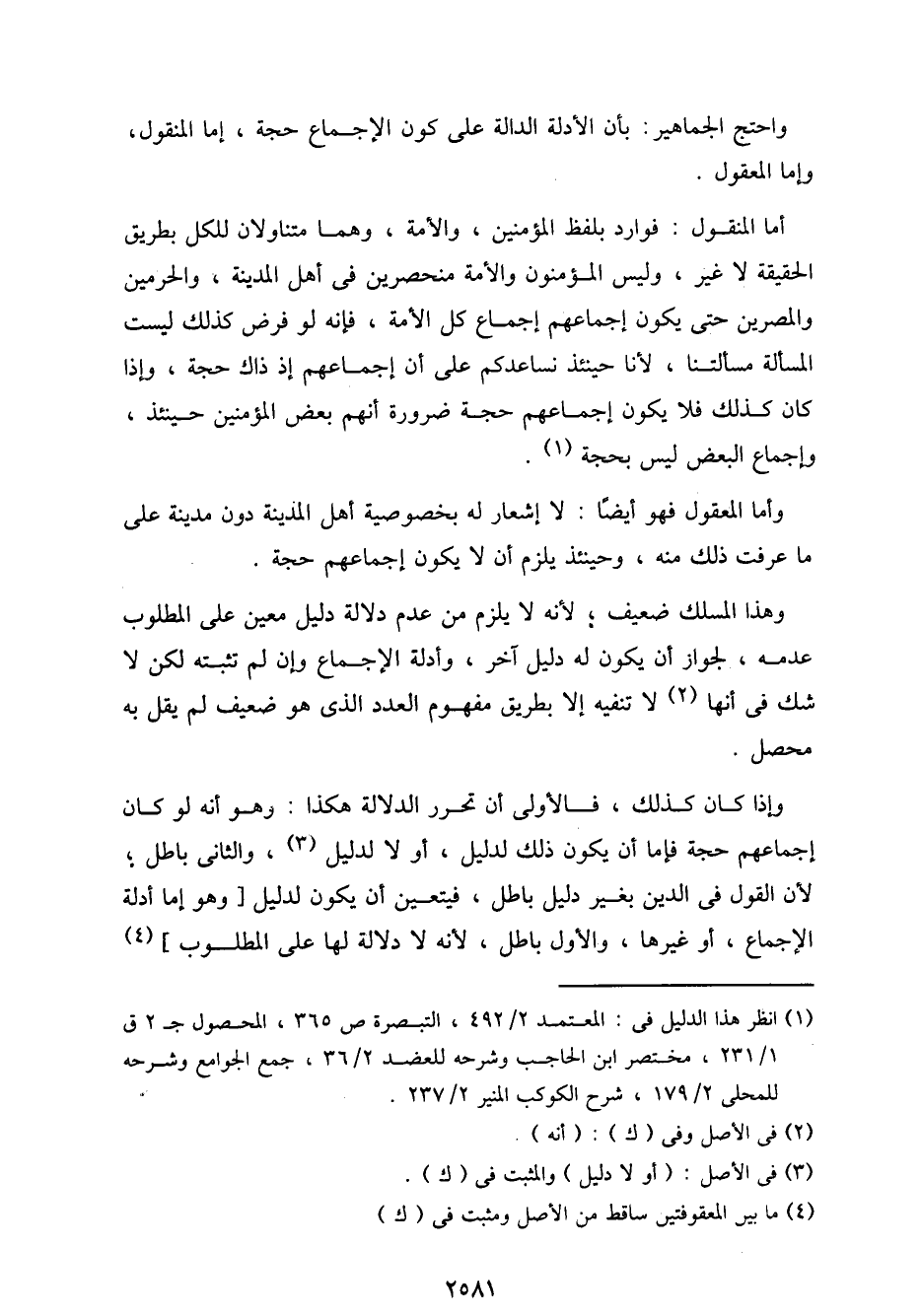 واحتج الجماهير: بأن الأدلة الدالة على كون الإجماع حجة، إما المنقول، وإما المعقول.