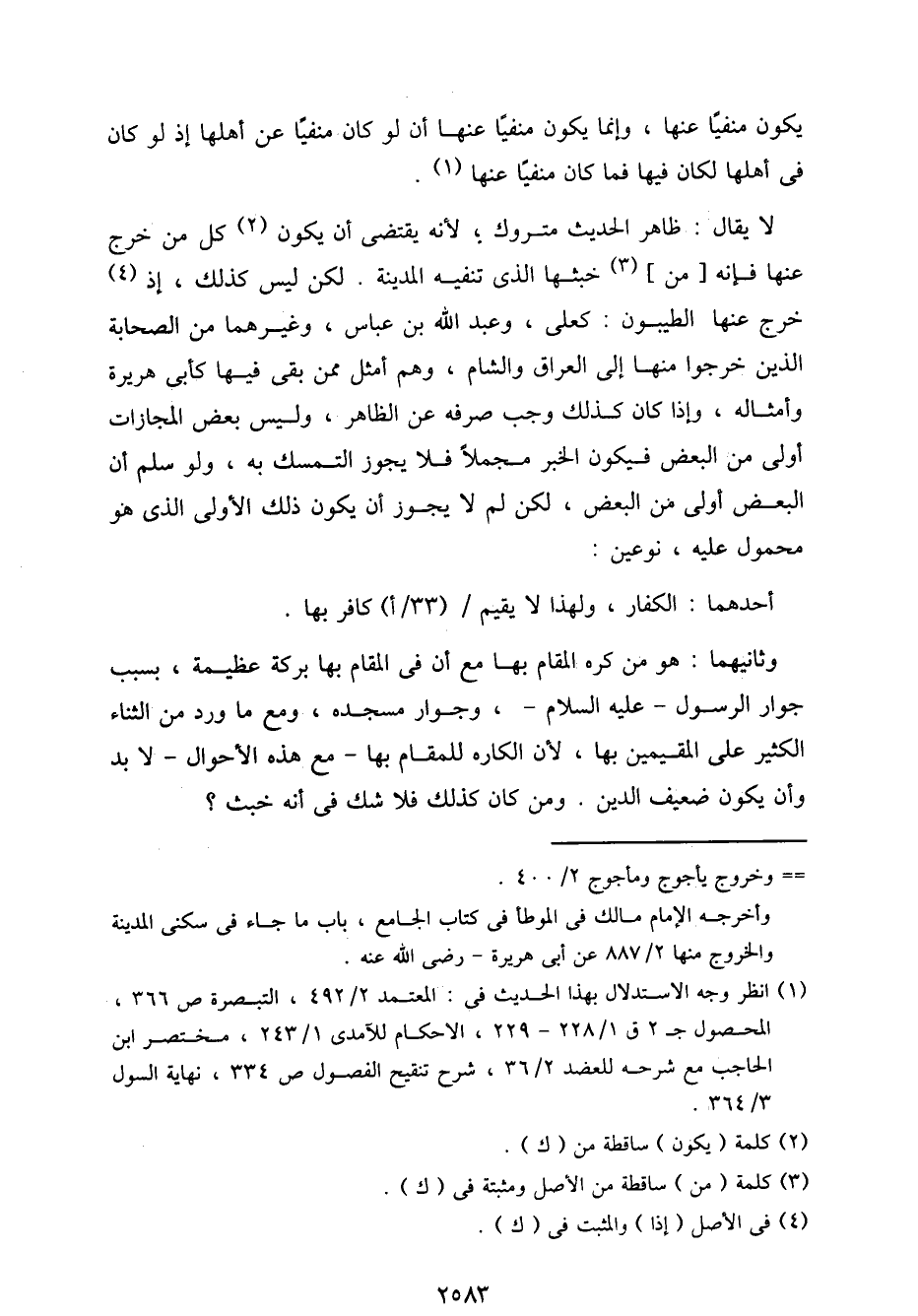 وثانيهما: هو من كره المقام بها مع أن في المقام بها بركة عظيمة، بسبب جوار الرسول - عليه السلام-، وجوار مسجده، ومع ما ورد من الثناء الكثير على المقيمين بها، لأن الكاره للمقام بها - مع هذه الأحوال - لا بد وأن يكون ضعيف الدين. ومن كان كذلك فلا شك في أنه خبث؟