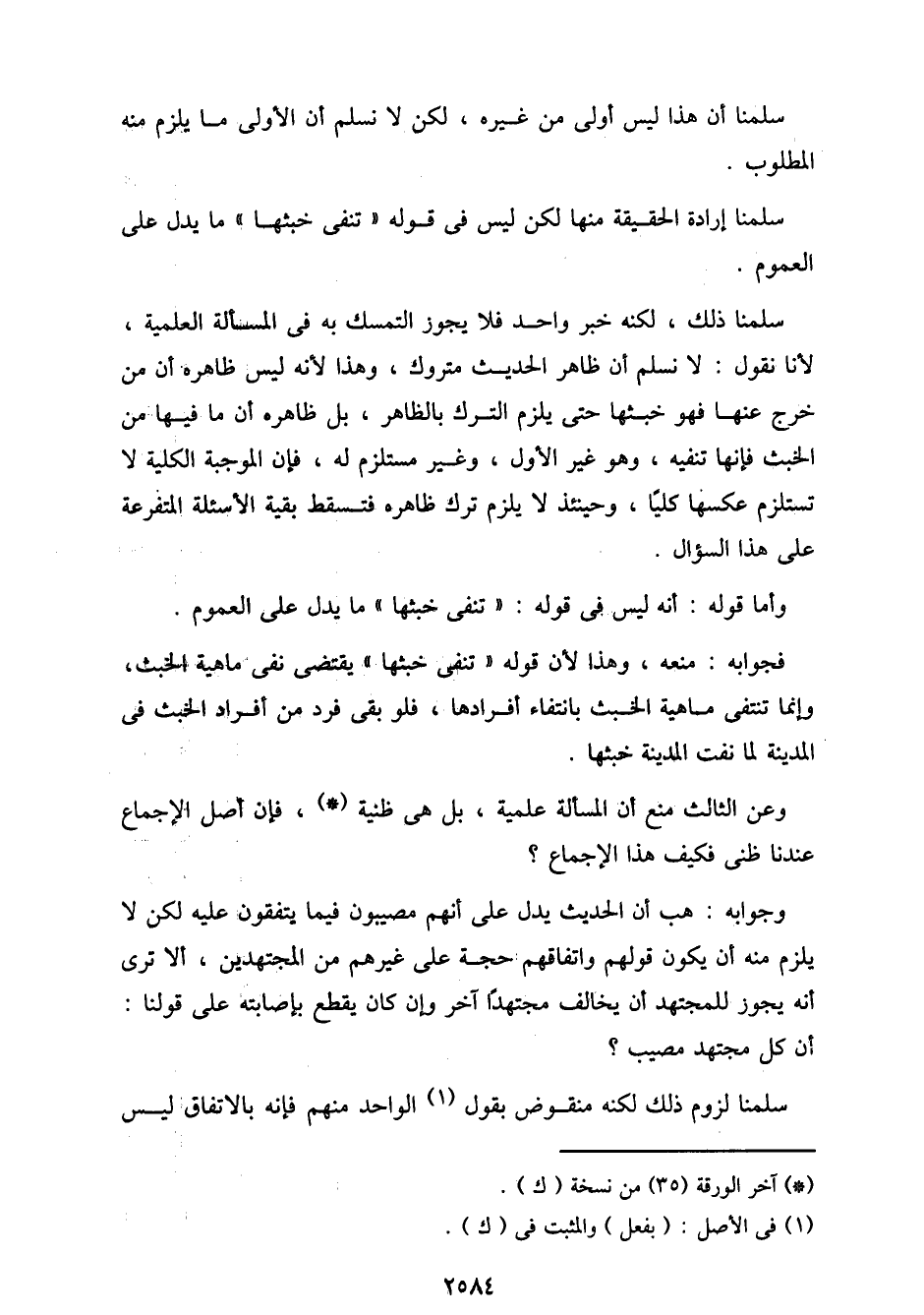 سلمنا ذلك، لكنه خبر واحد فلا يجوز التمسك به في المسألة العلمية، لأنا نقول: لا نسلم أن ظاهر الحديث متروك، وهذا لأنه ليس ظاهره أن من خرج عنها فهو خبثها حتى يلزم الترك بالظاهر، بل ظاهره أن ما فيها من الخبث فإنها تنفيه، وهو غير الأول، وغير مستلزم له، فإن الموجبة الكلية لا تستلزم عكسها كليًا، وحينئذ لا يلزم ترك ظاهره فتسقط بقية الأسئلة المتفرعة على هذا السؤال.