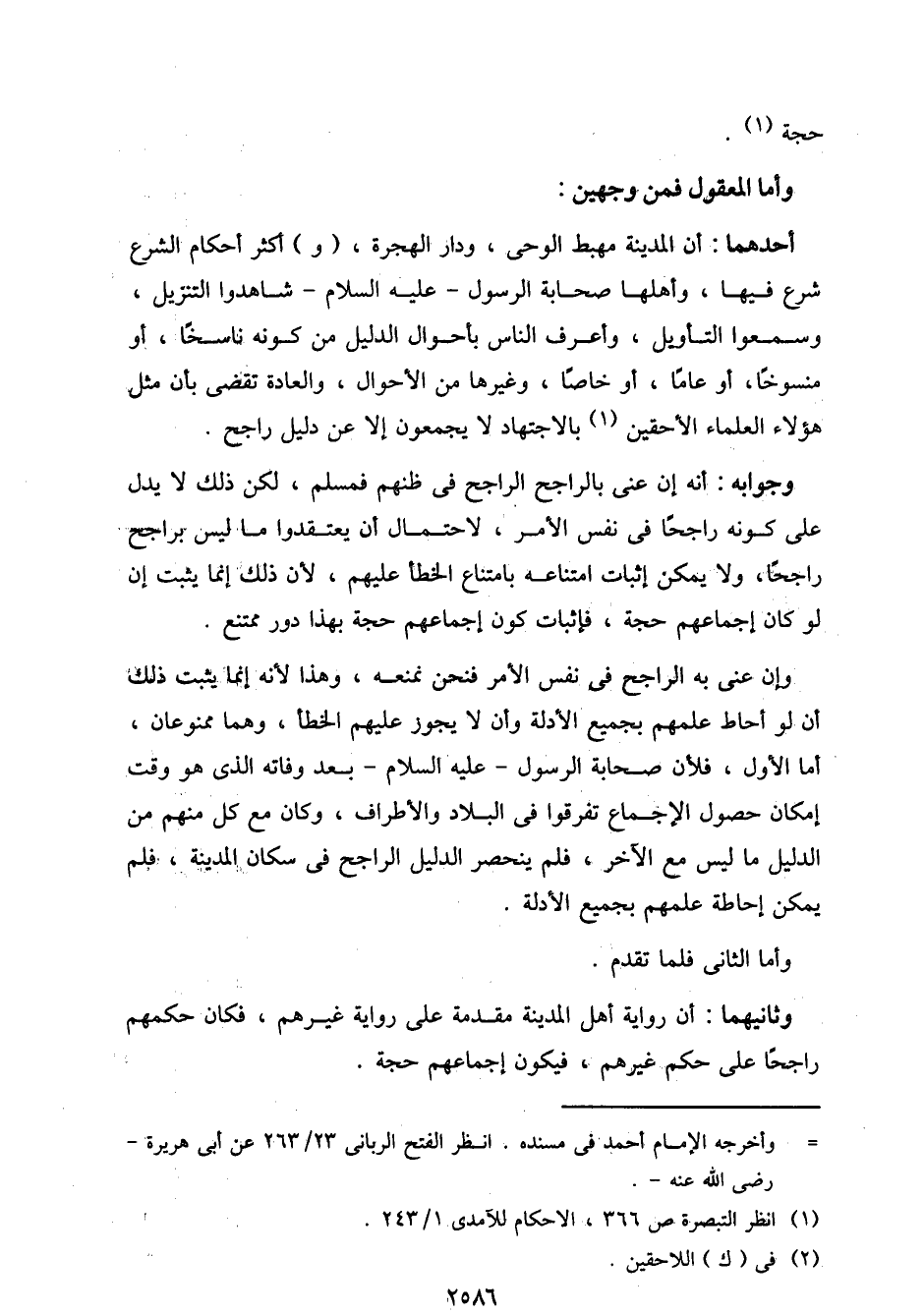 أحدهما: أن المدينة مهبط الوحي، ودار الهجرة، (و) أكثر أحكام الشرع شرع فيها، وأهلها صحابة الرسول - عليه السلام - شاهدوا التنزيل، وسمعوا التأويل، وأعرف الناس بأحوال الدليل من كونه ناسخًا، أو منسوخًا، أو عامًا، أو خاصًا، وغيرها من الأحوال، والعادة تقضي بأن مثل هؤلاء العلماء الأحقين بالاجتهاد لا يجمعون إلا عن دليل راجح.