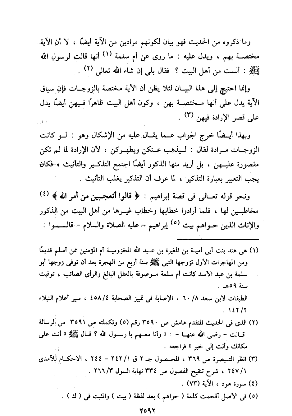 وما ذكروه من الحديث فهو بيان لكونهم مرادين من الآية أيضًا، لا أن الآية مختصة بهم، ويدل عليه: ما روي عن أم سلمة أنها قالت لرسول الله صلى الله عليه وسلم: ألست من أهل البيت؟ فقال بلى إن شاء الله تعالى.