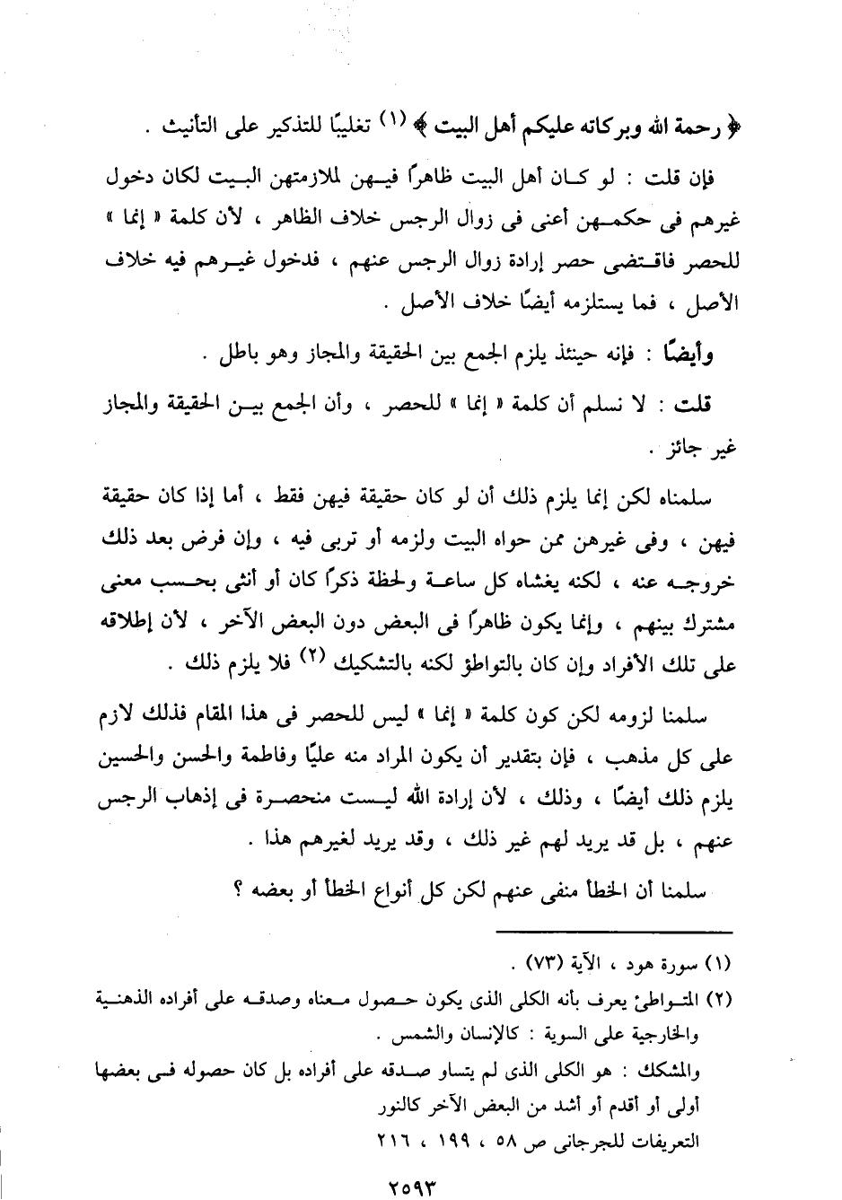 سلمنا لزومه لكن كون كلمة "إنما" ليس للحصر في هذا المقام فذلك لازم على كل مذهب، فإن بتقدير أن يكون المراد منه عليًا وفاطمة والحسن والحسين يلزم ذلك أيضًا، وذلك، لأن إرادة الله ليست منحصرة في إذهاب الرجس عنهم، بل قد يريد لهم غير ذلك، وقد يريد لغيرهم هذا.