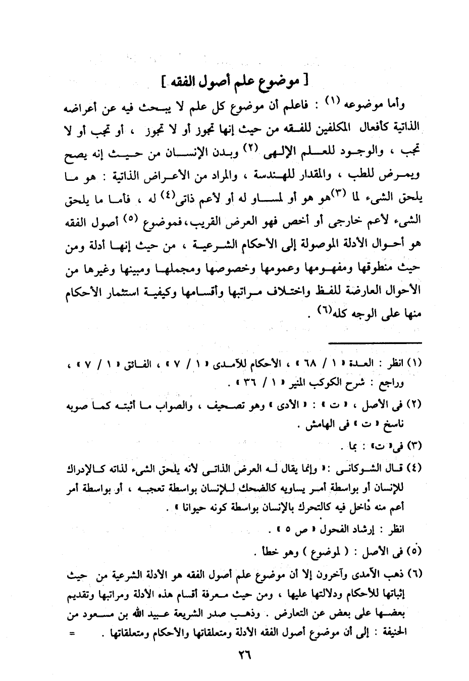 وأما موضوعه: فاعلم أن موضوع كل علم لا يبحث فيه عن أعراضه الذاتية كأفعال المكلفين للفقه من حيث إنها تجوز أو لا تجوز، أو تجب أو لا تجب، والوجود للعلم الإلهي وبدن الإنسان من حيث إنه يصح ويمرض للطب، والمقدار للهندسة، والمراد من الأعراض الذاتية: هو ما يلحق الشيء لما هو هو أو لمساوي له أو لأعم ذاتي له، فأما ما يلحق الشيء لأعم خارجي أو أخص فهو العرض القريب، فموضوع أصول الفقه هو أحوال الأدلة الموصولة إلى الأحكام الشرعية، من يحث إنها أدلة ومن حيث منطوقها ومفهومها وعمومها وخصوصها ومجملها ومبينها وغيرها من الأحوال العارضة للفظ واختلاف مراتبها وأقسامها وكيفية استثمار الأحكام منها على الوجه كله.