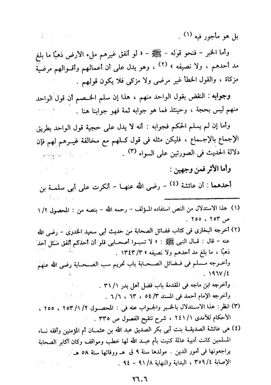 وأما الخبر - فنحو قوله - صلى الله عليه وسلم - "لو أنفق غيرهم ملء الأرض ذهبًا ما بلغ مد أحدهم، ولا نصيفه"، وهو يدل على أن أعمالهم وأقوالهم مرضية مزكاة، والقول الخطأ غير مرضي ولا مزكي فلا يكون قولهم.