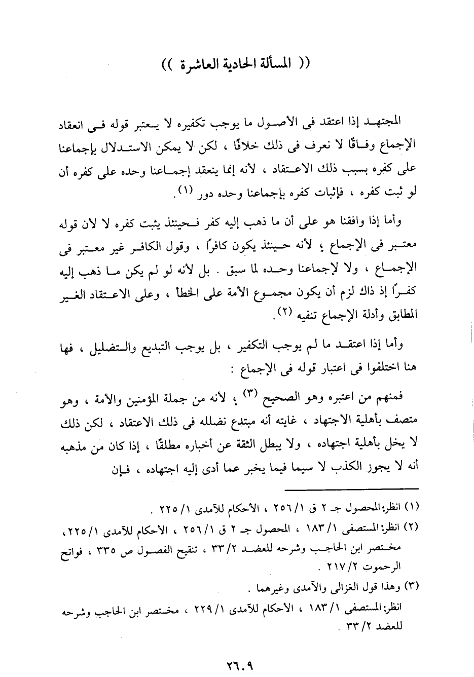 المجتهد إذا اعتقد في الأصول ما يوجب تكفيره لا يعتبر قوله في انعقاد الإجماع وفاقًا لا نعرف في ذلك خلافًا، لكن لا يمكن الاستدلال بإجماعنا على كفره بسبب ذلك الاعتقاد، لأنه إنما ينعقد إجماعنا وحده على كفره أن لو ثبت كفره، فإثبات كفره بإجماعنا وحده دور.