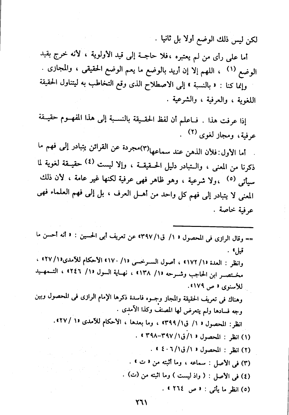 أما الأول: فلأن الذهن عند سماعها مجردة عن القرائن يتبادر إلى فهم ما ذكرنا من المعنى، والتبادر دليل الحقيقة، وإلا ليست حقيقة لغوية لما سيأتي، ولا شرعية، وهو ظاهر فهي عرفية لكنها غير عامة، لأن ذلك المعنى لا يتبادر إلى فهم كل واحد من أهل العرف، بل إلى فهم العلماء فهي عرفية خاصة.