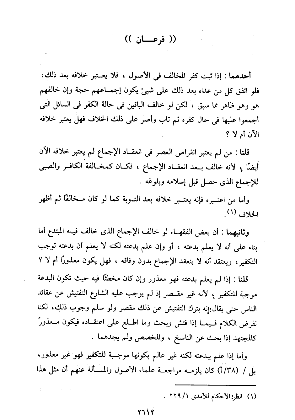 أحدهما: إذا ثبت كفر المخالف في الأصول، فلا يعتبر خلافه بعد ذلك، فلو اتفق كل من عداه بعد ذلك على شيء يكون إجماعهم حجة وإن خالفهم هو وهو ظاهر مما سبق، لكن لو خالف الباقين في حالة الكفر في السائل التي أجمعوا عليها في حال كفره ثم تاب وأصر على ذلك الخلاف فهل يعتبر خلافه الآن أم لا؟