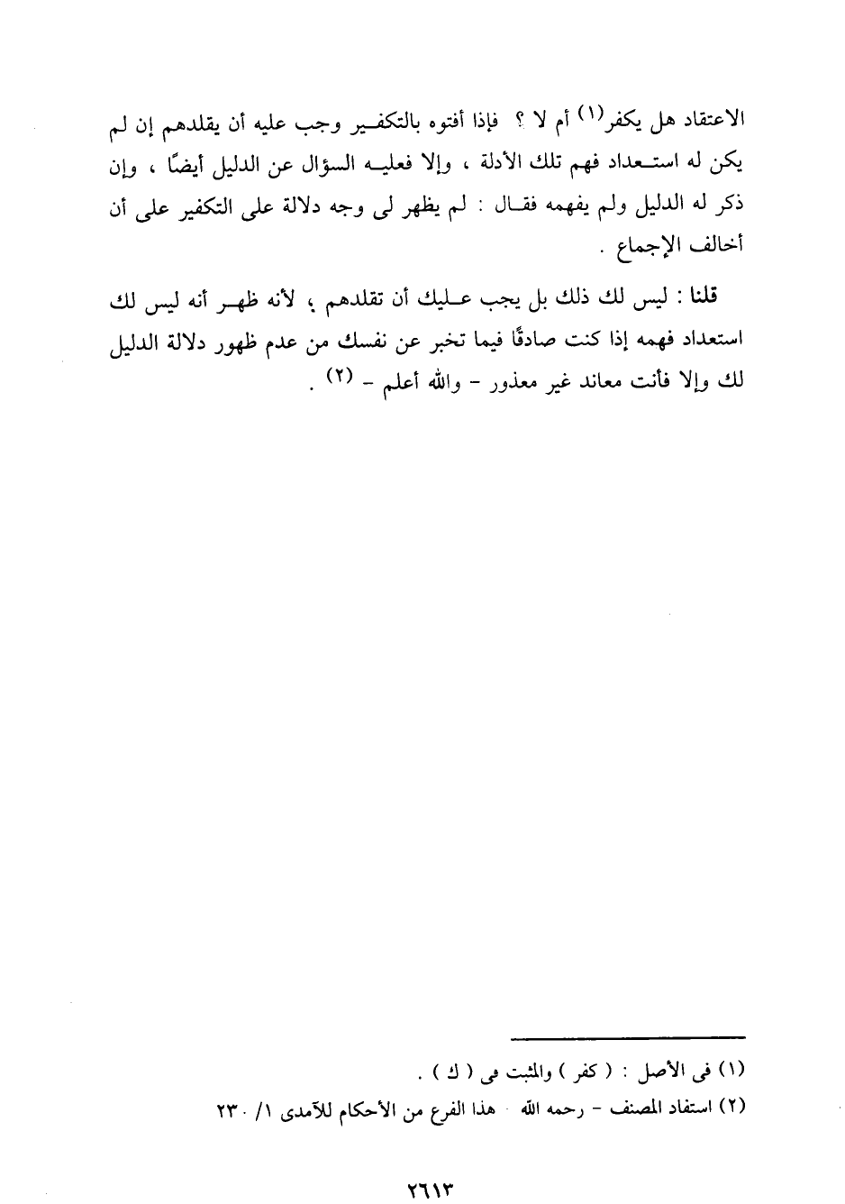 الاعتقاد هل يكفر أم لا؟ فإذا أفتوه بالتكفير وجب عليه أن يقلدهم إن لم يكن له استعداد فهم تلك الأدلة، وإلا فعليه السؤال عن الدليل أيضًا، وإن ذكر له الدليل ولم يفهمه فقال: لم يظهر لي وجه دلالة على التكفير على أن أخالف الإجماع.