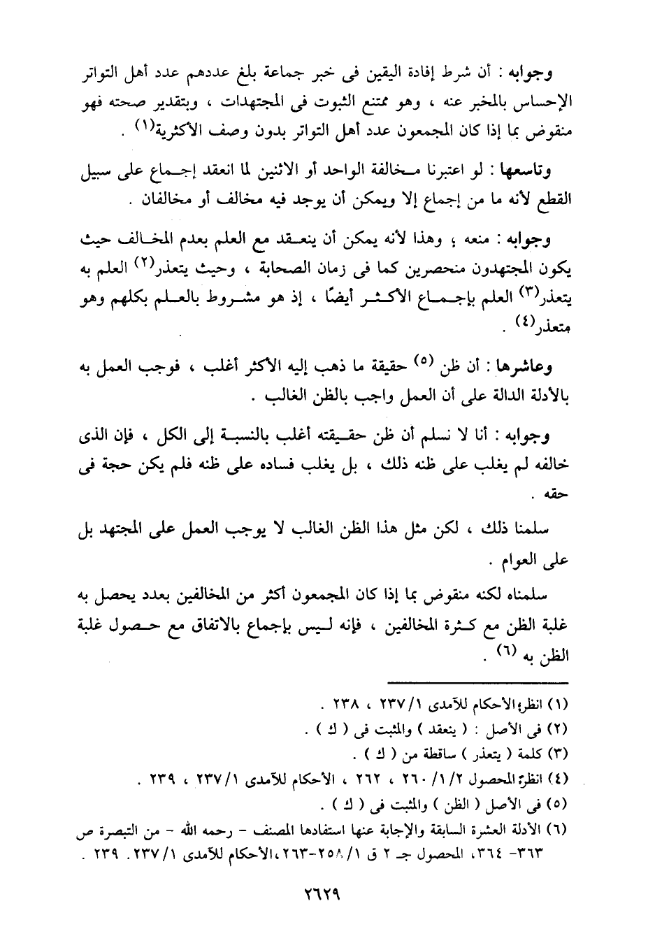 وجوابه: أن شرط إفادة اليقين في خبر جماعة بلغ عددهم عدد أهل التواتر الإحساس بالمخبر عنه، وهو ممتنع الثبوت في المجتهدات، وبتقدير صحته فهو منقوض بما إذا كان المجمعون عدد أهل التواتر بدون وصف الأكثرية.