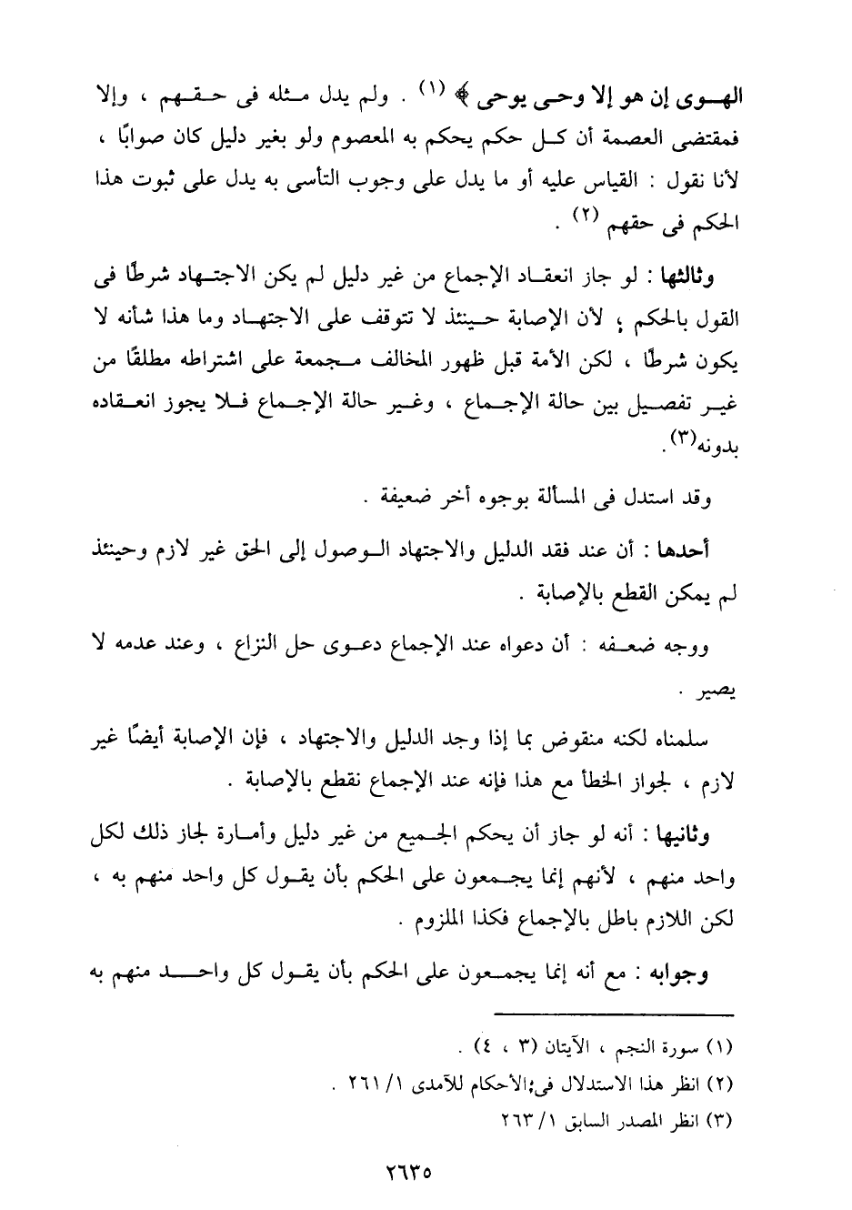 وثالثها: لو جاز انعقاد الإجماع من غير دليل لم يكن الاجتهاد شرطًا في القول بالحكم؛ لأن الإصابة حينئذ لا تتوقف على الاجتهاد وما هذا شأنه لا يكون شرطًا، لكن الأمة قبل ظهور المخالف مجمعة على اشتراطه مطلقًا من غير تفصيل بين حالة الإجماع، وغير حالة الإجماع فلا يجوز انعقاده بدونه.