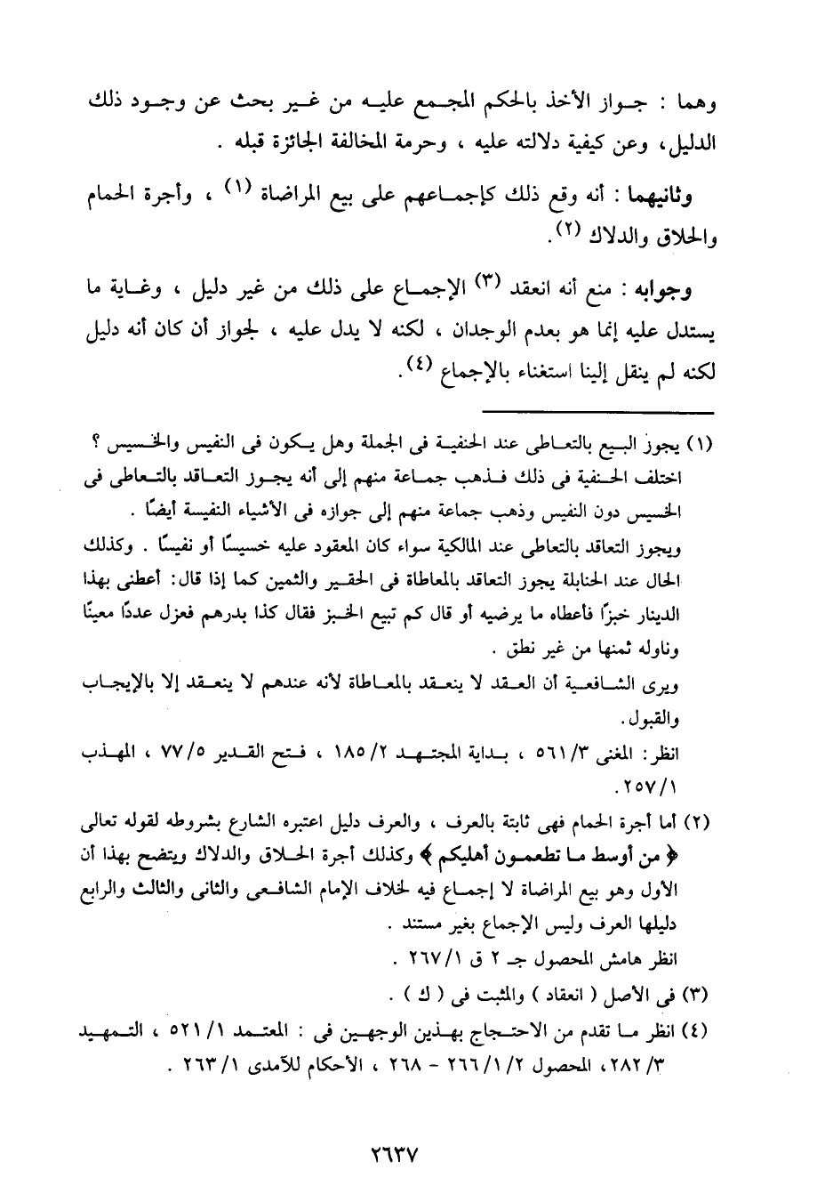 وثانيهما: أنه وقع ذلك كإجماعهم على بيع المراضاة، وأجرة الحمام والحلاق والدلاك.