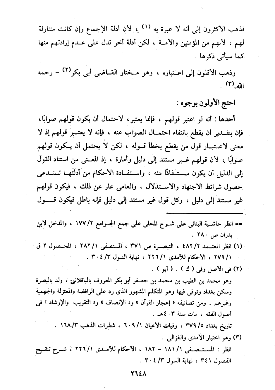 أحدها: أنه لو اعتبر قولهم، فإنما بعتبر، لاحتمال أن يكون قولهم صوابًا، فإن بتقدير أن يقطع بانتفاء احتمال الصواب عنه، فإنه لا يعتبر قولهم إذ لا معنى لاعتبار قول من يقطع بخطأ قوله، لكن لا يحتمل أن يكون قولهم صوابًا، لأن قولهم غير مستند إلى دليل وأمارة، إذ المعنى من استناد القول إلى الدليل أن يكون مستفادًا منه، واستفادة الأحكام من أدلتها تستدعي حصول شرائط الاجتهاد والاستدلال، والعامي عار عن ذلك، فيكون قولهم غير مستند إلى دليل، وكل قول غير مستند إلى دليل فإنه باطل فيكون قول