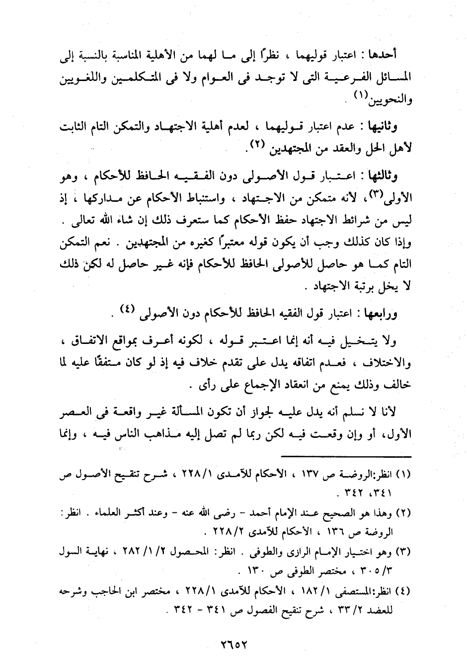 وثالثها: اعتبار قول الأصولي دون الفقيه الحافظ للأحكام، وهو الأولى، لأنه متمكن من الاجتهاد، واستباط الأحكام عن مداركها، إذ ليس من شرائط الاجتهاد حفظ الأحكام كما ستعرف ذلك إن شاء الله تعالى. وإذا كان كذلك وجب أن يكون قوله معتبرًا كغيره من المجتهدين. نعم التمكن التام كما هو حاصل للأصولي الحافظ للأحكام فإنه غير حاصل له لكن ذلك لا يخل برتبة الاجتهاد.
