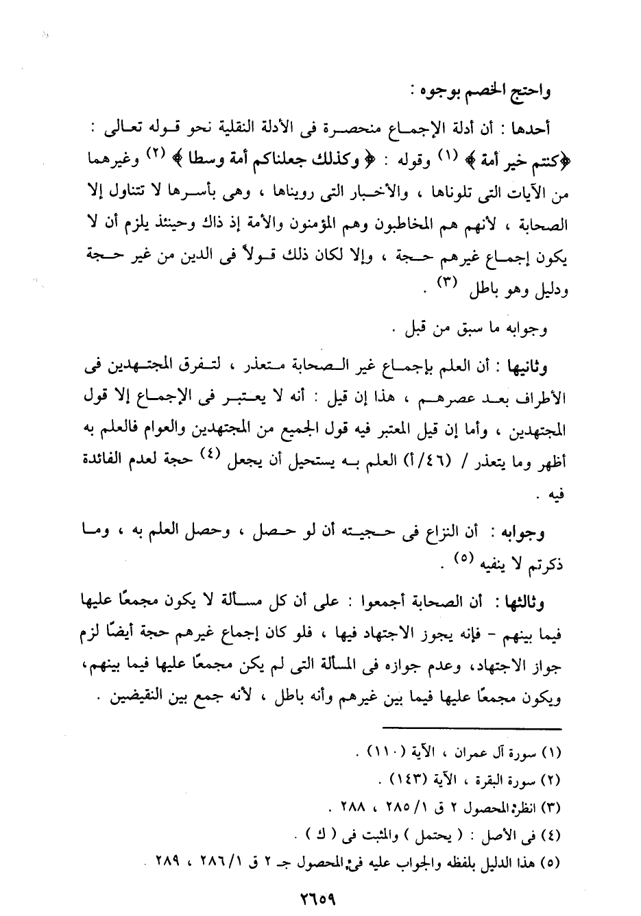 أحدها: أن أدلة الإجماع منحصرة في الأدلة النقلية نحو قوله تعالى: {كنتم خير أمة} وقوله: {وكذلك جعلناكم أمة وسطا} وغيرهما من الآيات التي تلوناها، والأخبار التي رويناها، وهي بأسرها لا تتناول إلا الصحابة، لأنهم هم المخاطبون وهم المؤمنون والأمة إذ ذاك وحينئذ يلزم أن لا يكون إجماع غيرهم حجة، وإلا لكان ذلك قولاً في الدين من غير حجة ودليل وهو باطل.