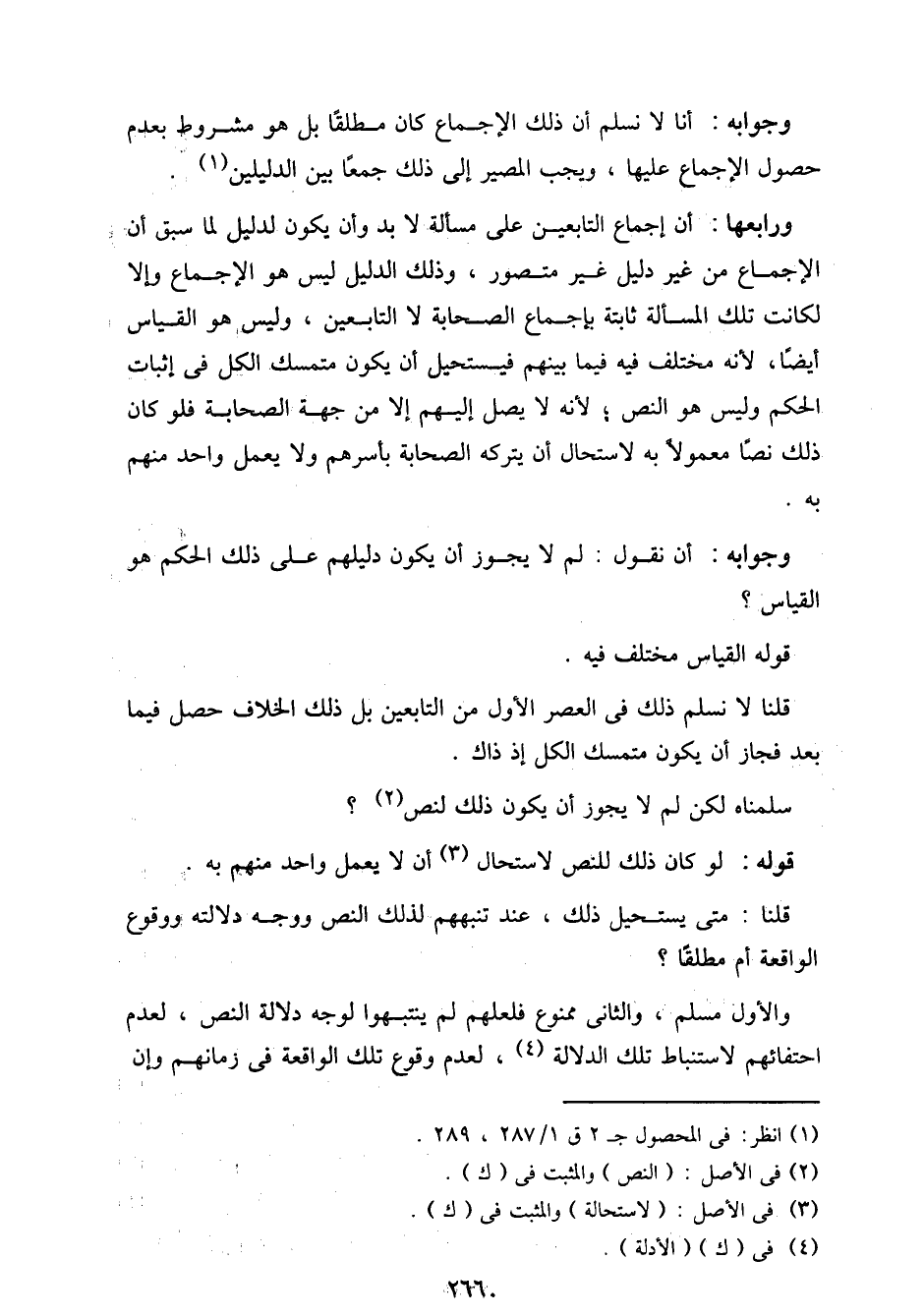 ورابعها: أن إجماع التابعين على مسألة لا بد وأن يكون لدليل لما سبق أن الإجماع من غير دليل غير متصور، وذلك الدليل ليس هو الإجماع وإلا لكانت تلك المسألة ثابتة بإجماع الصحابة لا التابعين، وليس هو القياس أيضًا، لأنه مختلف فيه فيما بينهم فيستحيل أن يكون متمسك الكل في إثبات الحكم وليس هو النص؛ لأنه لا يصل إليهم إلا من جهة الصحابة فلو كان ذلك نصًا معمولاً به لاستحال أن يتركه الصحابة بأسرهم ولا يعمل واحد منهم به.