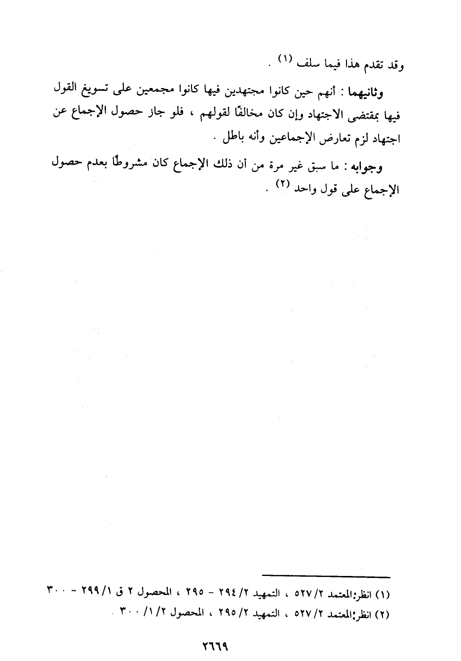 وثانيهما: أنهم حين كانوا مجتهدين فيها كانوا مجمعين على تسويغ القول فيها بمقتضى الاجتهاد وإن كان مخالفًا لقولهم، فلو جاز حصول الإجماع عن اجتهاد لزم تعارض الإجماعين وأنه باطل.